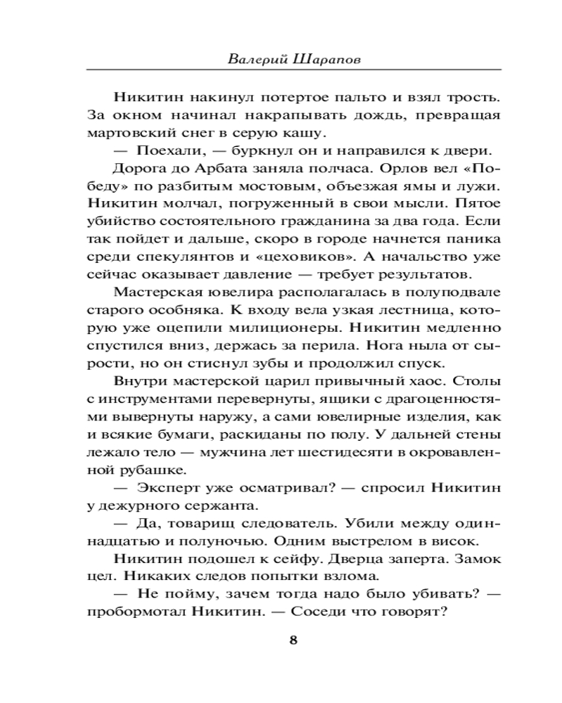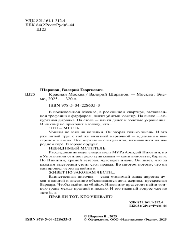 Серия: Подмосковные вечера. Детективы о послевоенном уголовном розыске В послевоенной Москве, в роскошной квартире, заставленной трофейным фарфором, лежит убитый ювелир. На виске — аккуратная дырочка. На столе — пачки денег и золотые украшения. И никому не приходит в голову, что... Это — месть. Убийца не взял ни копейки. Он забрал только жизнь. И это уже пятый труп с той же визитной карточкой — идеальным выстрелом в висок. Все жертвы — спекулянты, нажившиеся на народном горе. В городе орудует невидимый мститель. |