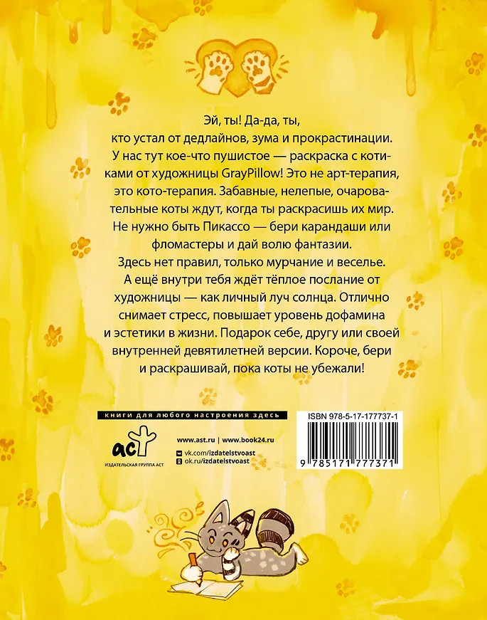 Серия: Раскраска-вдохновение Эй, ты! Да-да, ты, кто устал от дедлайнов, зума и прокрастинации. У нас тут кое-что пушистое — раскраска с котиками от художницы GrayPillow! Это не арт-терапия, это кото-терапия. Забавные, нелепые, очаровательные коты ждут, когда ты раскрасишь их жизнь. Не нужно быть Пикассо — бери карандаши или фломастеры и дай волю фантазии. Здесь нет правил, только мурчание и веселье. |