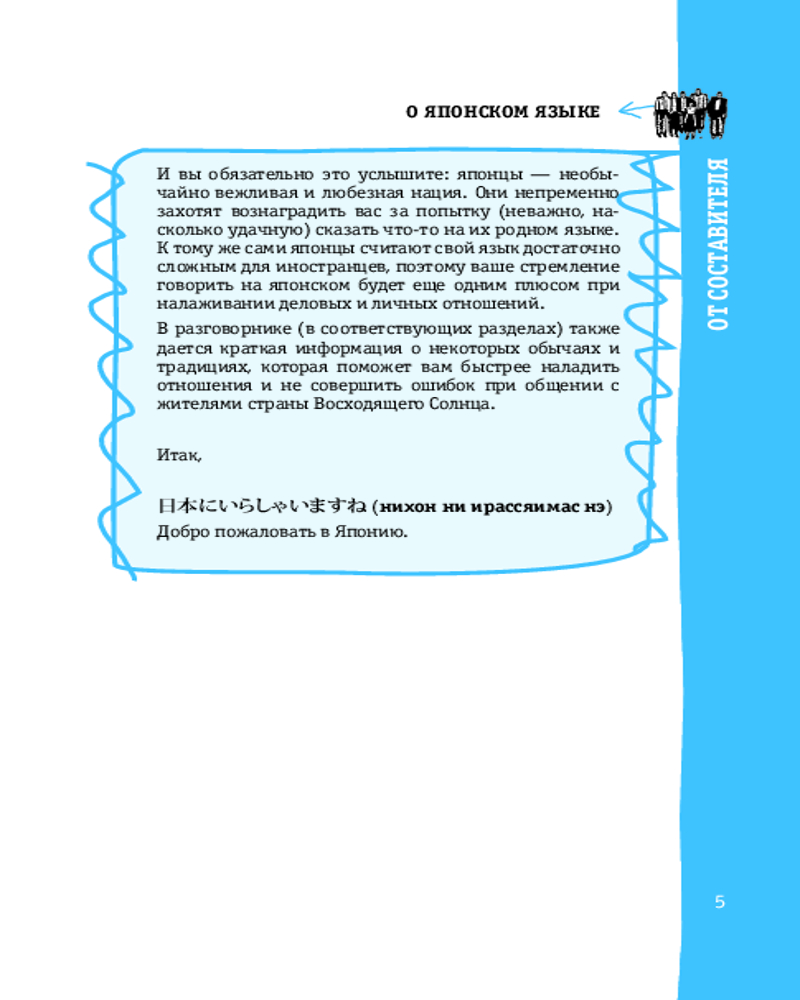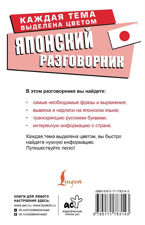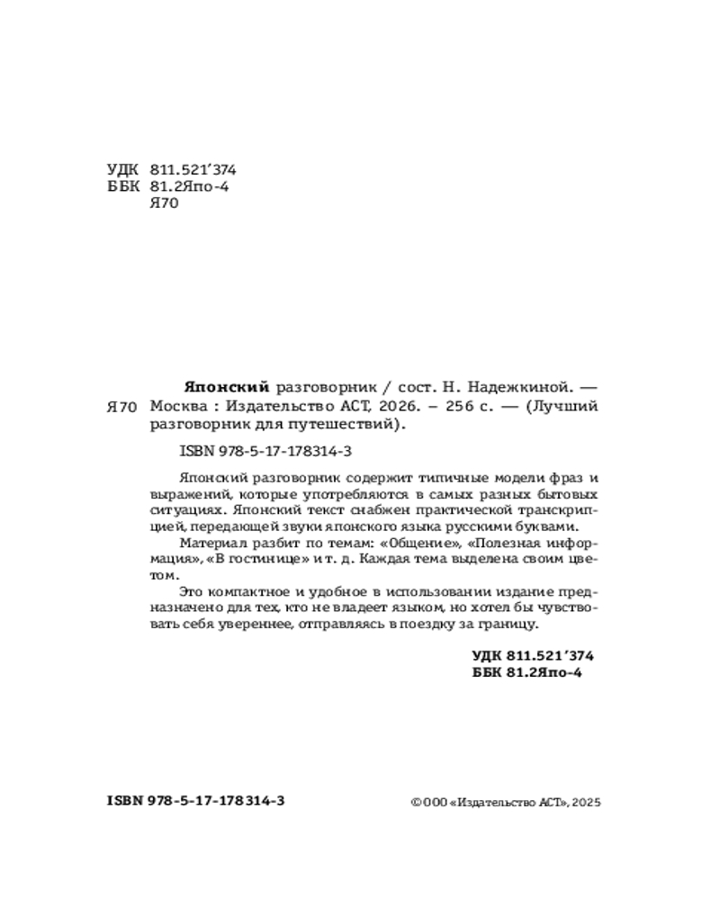 Серия: Лучший разговорник для путешествий Японский разговорник содержит типичные модели фраз и выражений, которые употребляются в самых разных бытовых ситуациях. Японский текст снабжен практической транскрипцией, передающей звуки японского языка русскими буквами. Материал разбит по темам: «Общение», «Полезная информация», «В гостинице» и т. д. Каждая тема выделена своим цветом. Это компактное и удобное в использовании издание предназначено для тех, кто не владеет языком, но хотел бы чувствовать себя увереннее, отправляясь в поездку за границу. |