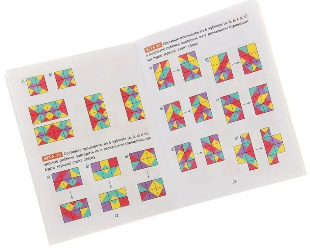 В наборе 12 кубиков. Кубики компактные и лёгкие, удобно ложатся в маленькую детскую руку. На каждом из них рисунки с геометрическими орнаментами разных цветов. В комплекте книжка для родителей с подробным описанием 50 развивающих игр и упражнений.