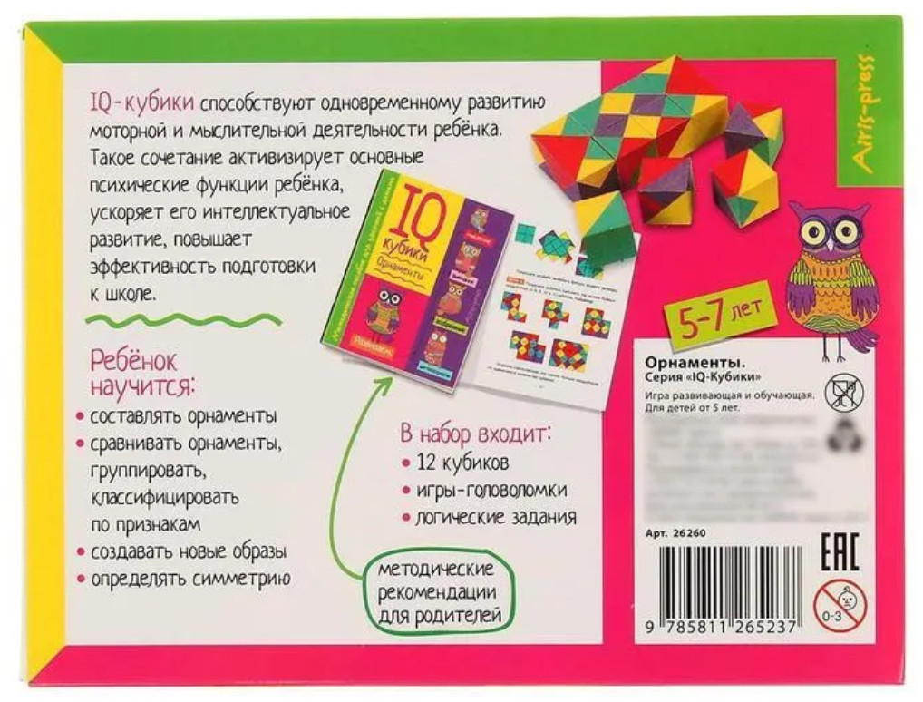 IQ-кубики «Орнаменты» — универсальный набор интеллектуальных игр для дошкольников. IQ-кубики помогают развивать моторную и мыслительную деятельность одновременно. Такое сочетание активизирует основные психические функции ребёнка, ускоряет его интеллектуальное развитие, повышает эффективность подготовки к школе.