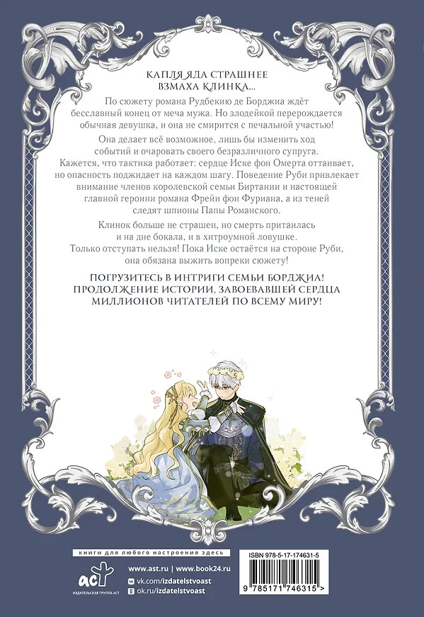 Серия: Вебтун. Как переманить мужа на свою сторону Капля яда страшнее взмаха клинка... По сюжету романа Рудбекию де Борджиа ждёт бесславный конец от меча мужа. Но злодейкой перерождается обычная девушка, и она не смирится с печальной участью! Она делает всё возможное, лишь бы изменить ход событий и очаровать своего безразличного супруга. Кажется, что тактика работает: сердце Иске фон Омерта оттаивает, но опасность поджидает на каждом шагу. Поведение Руби привлекает внимание членов королевской семьи Биртании и настоящей главной героини романа Фрейи фон Фуриана, а из теней следят шпионы Папы Романского. Клинок больше не страшен, но смерть притаилась и на дне бокала, и в хитроумной ловушке. Только отступать нельзя! Пока Иске остаётся на стороне Руби, она обязана выжить вопреки сюжету! |