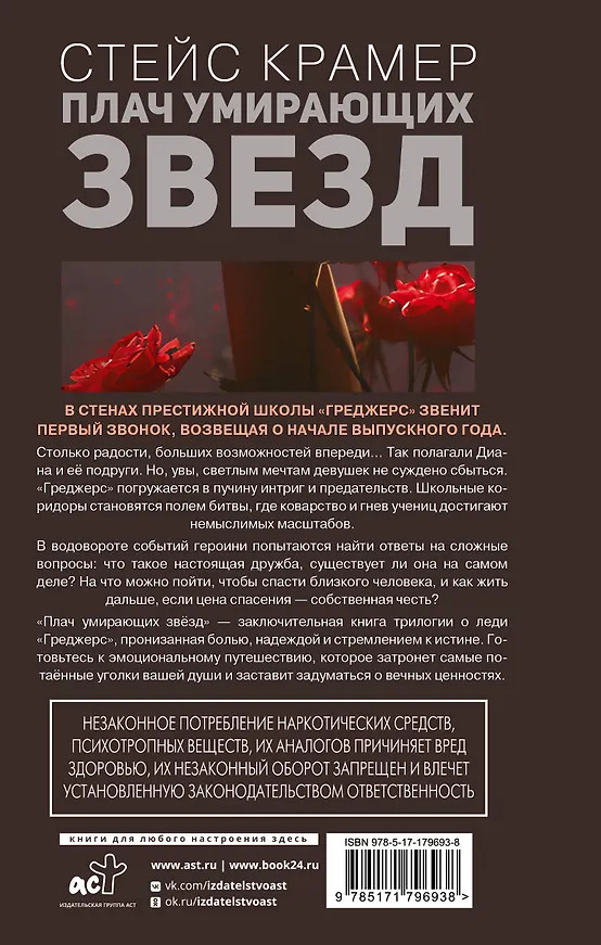 💳 Оплатить за товар можно при получении 🇰🇿 Есть бесплатная доставка по Казахстану 🎁 Копите бонусы с каждой покупки Серия: Проект Стейс Крамер В стенах престижной школы «Греджерс» звенит первый звонок, возвещая о начале выпускного года. Столько радости, больших возможностей впереди... Так полагали Диана и её подруги. Но, увы, светлым мечтам девушек не суждено сбыться. «Греджерс» погружается в пучину интриг и предательств. Школьные коридоры становятся полем битвы, где коварство и гнев учениц достигают немыслимых масштабов. В водовороте событий героини попытаются найти ответы на сложные вопросы: что такое настоящая дружба? Существует ли она на самом деле? На что можно пойти, чтобы спасти близкого человека, и как жить дальше, если цена спасения — собственная честь? |