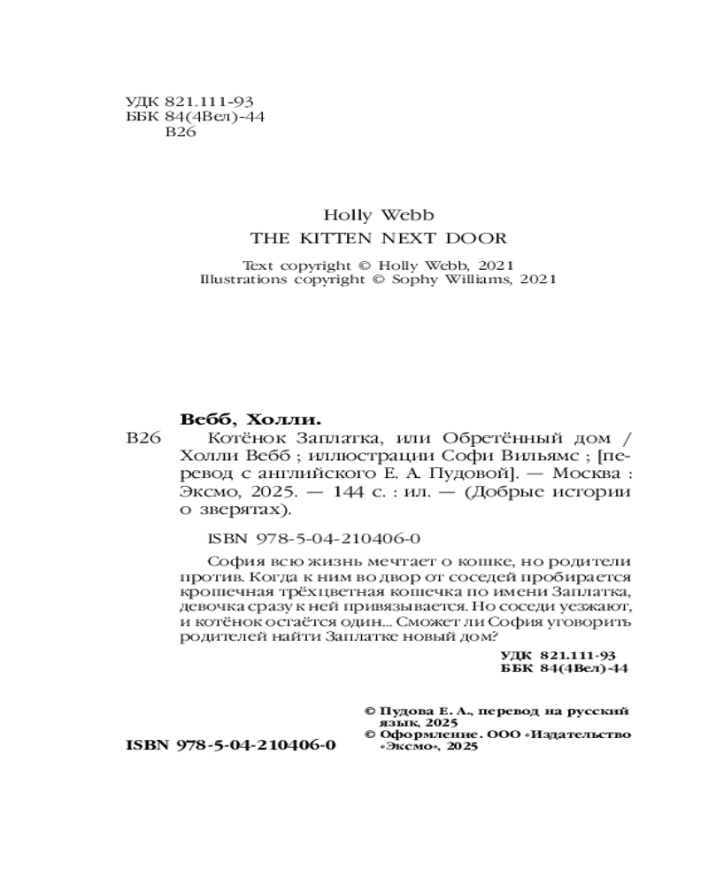 Серия: Холли Вебб. Добрые истории о зверятах. Мировой бестселлер София всю жизнь мечтает о кошке, но родители против. Когда к ним во двор от соседей пробирается крошечная трёхцветная кошечка, девочка сразу привязывается к ней и называет Заплаткой. Но соседи уезжают, и котёнок остаётся один... Сможет ли София уговорить родителей найти Заплатке новый дом? |
