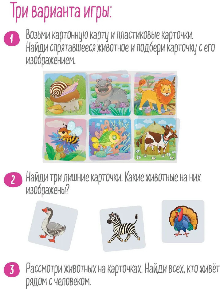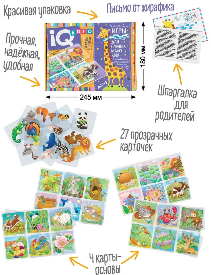 Лото «Играем в прятки. Кто это спрятался?» — это обучающая игра для детей, начиная с 3 лет (хотя набор понравится и тем кому 4 или 5 лет). На картах-основах изображены спрятавшиеся животные. Ребёнку предстоит внимательно рассмотреть иллюстрацию, определить, кто на ней прячется, и подобрать карточку с подходящим рисунком. Прозрачные карточки позволяют малышу экспериментировать и самостоятельно искать решение. |