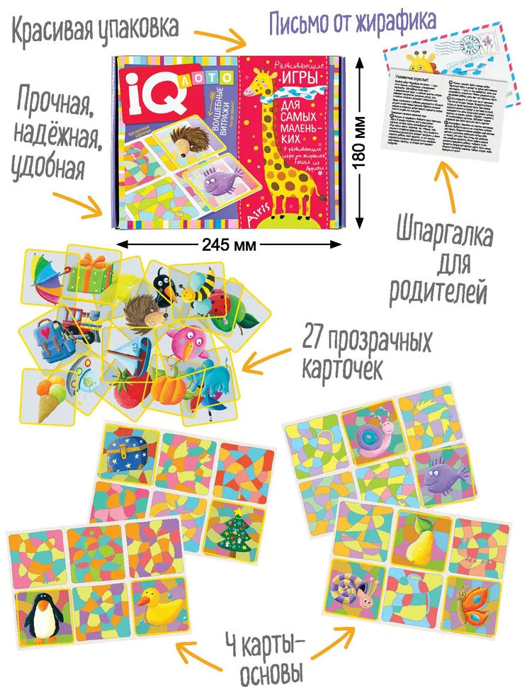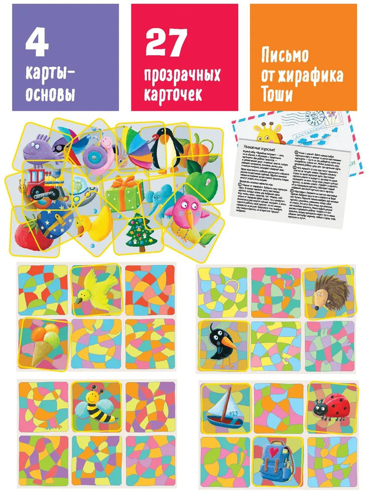 Лото «Волшебные витражи. Что где скрыто?» — это обучающая игра для детей, начиная с 4 лет (хотя набор понравится и тем кому 5 или 6 лет). На картах-основах представлены разноцветные витражи, в которых «спрятаны» различные предметы. Ребёнок должен догадаться, какой предмет скрыт на рисунке, и подобрать карточку с его изображением. |