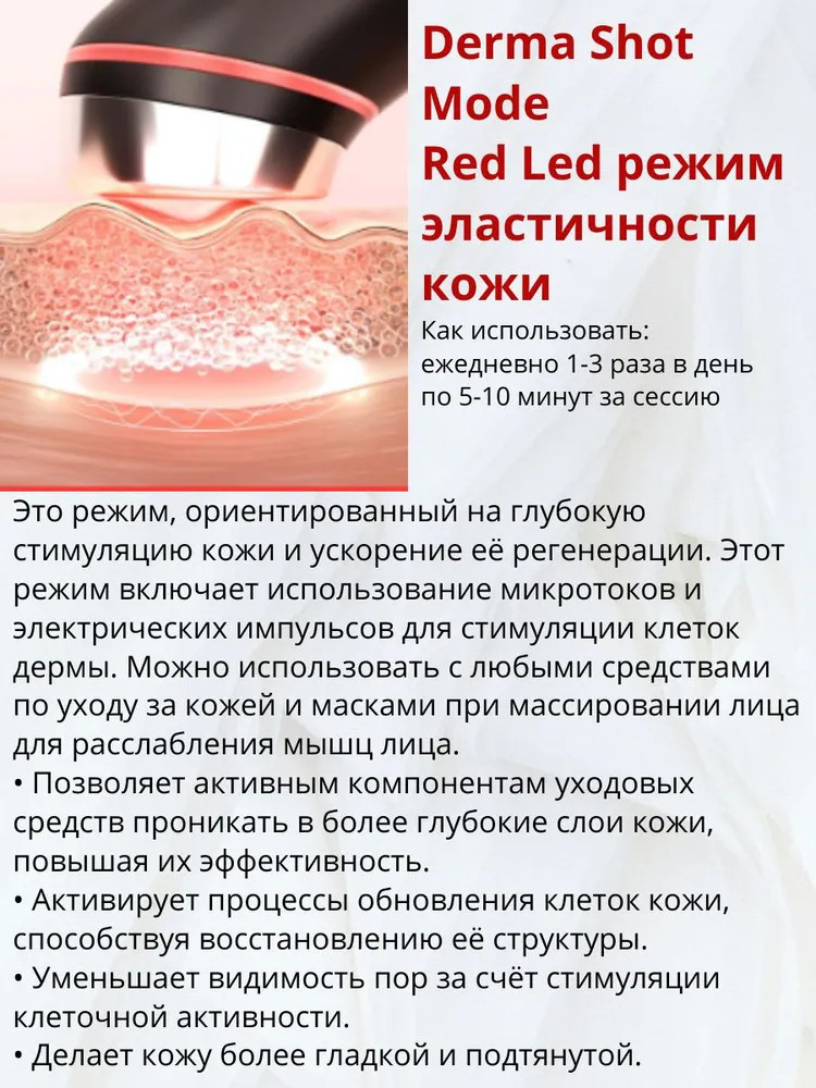 • derma shot mode (красный) — режим среднечастотного ems-лифтинга для восстановления тонуса мышц и ускорения лимфотока; формирует контуры и овал лица, укрепляет и препятствует птозу; обладает лимфодренажным свойством и устраняет отёчность; сокращает глубину морщин и препятствует их появлению; подходит для ежедневного применения по 5−10 минут, рекомендуется для использования в зоне скул и линии подбородка;