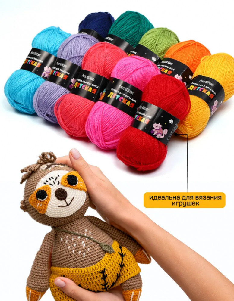 Пряжа для вязания Детская Magic4Hobby набор ассорти. В набор входит 10 мотков разных цветов по 150 метров 50 грамм каждый моток.