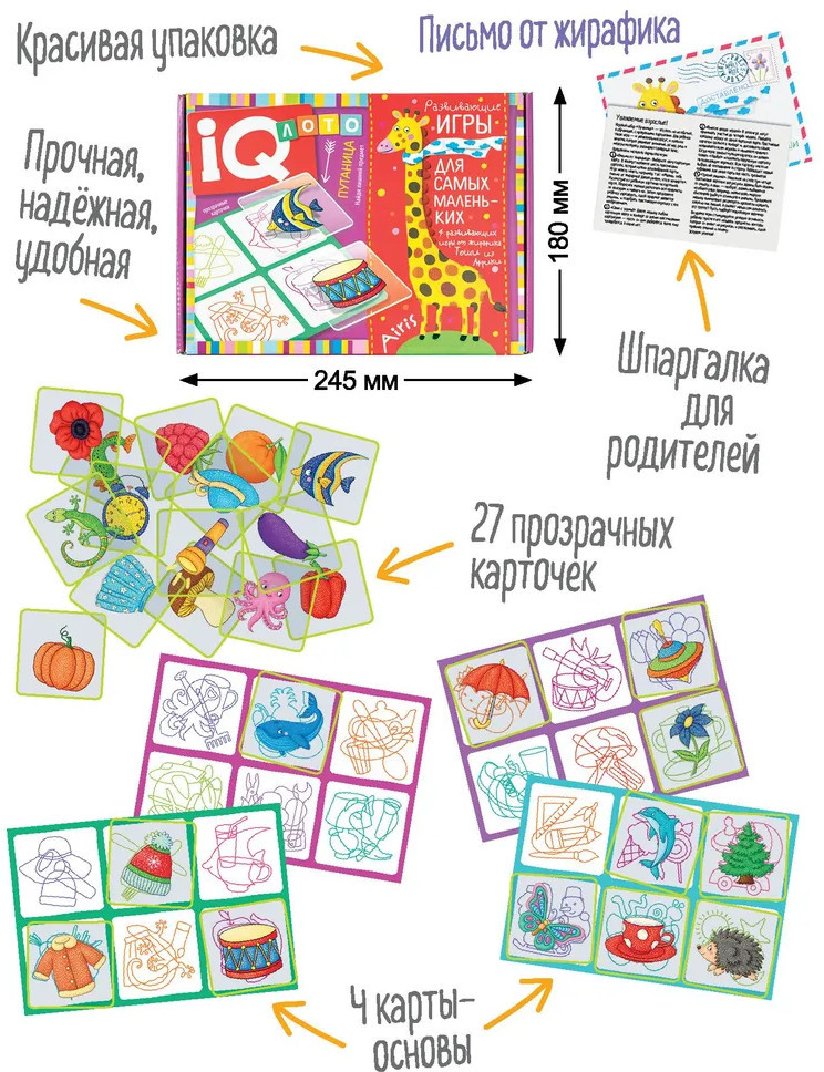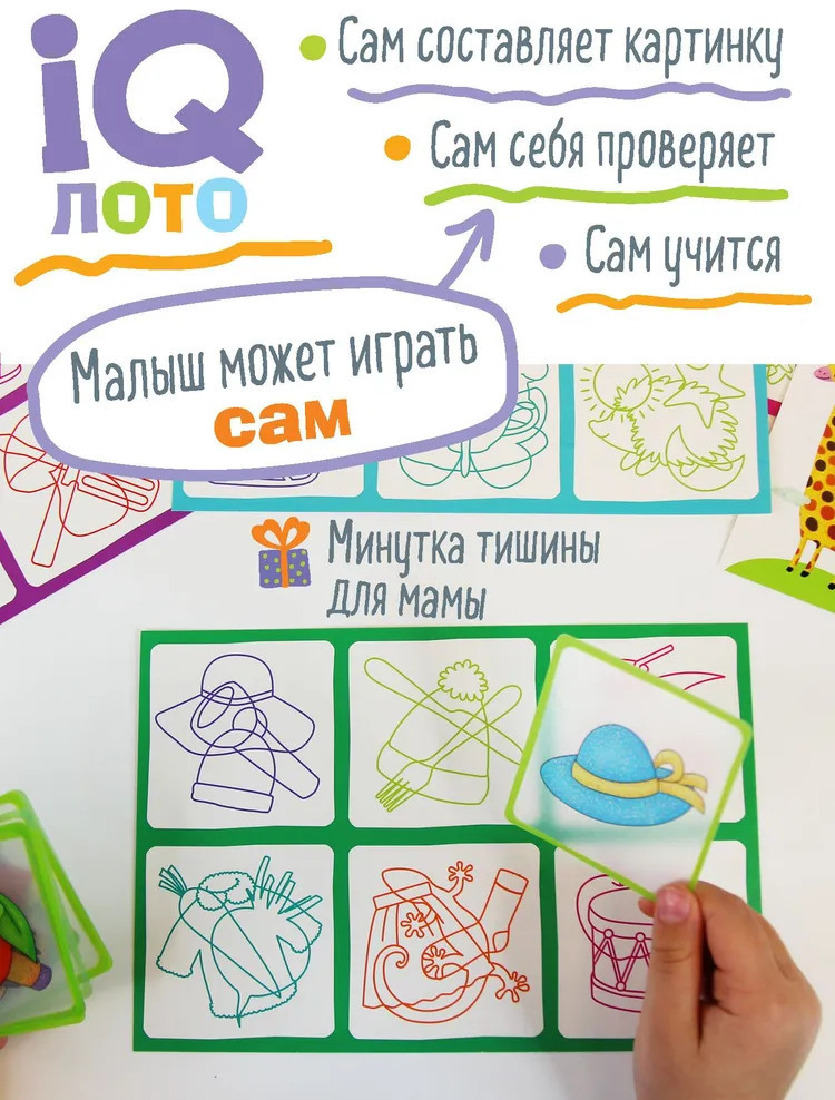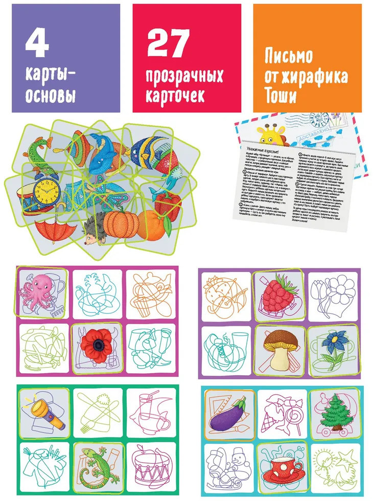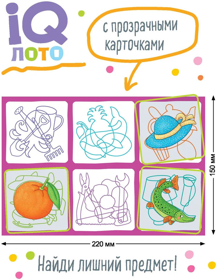 Лото «Путаница. Найди лишний предмет» — это обучающая игра для детей, начиная с 4 лет (хотя набор понравится и тем кому 5 или 6 лет). На картах-основах разноцветными линиями изображены контуры различных предметов. На рисунках все предметы объединены общей темой и только один предмет лишний. Ребёнку предстоит найти и назвать каждый предмет, затем решить, какой предмет выбивается из общего ряда, и подобрать карточку с его изображением. Прозрачные карточки позволяют малышу экспериментировать и самостоятельно искать решение. |