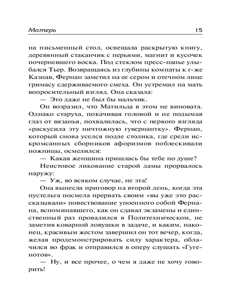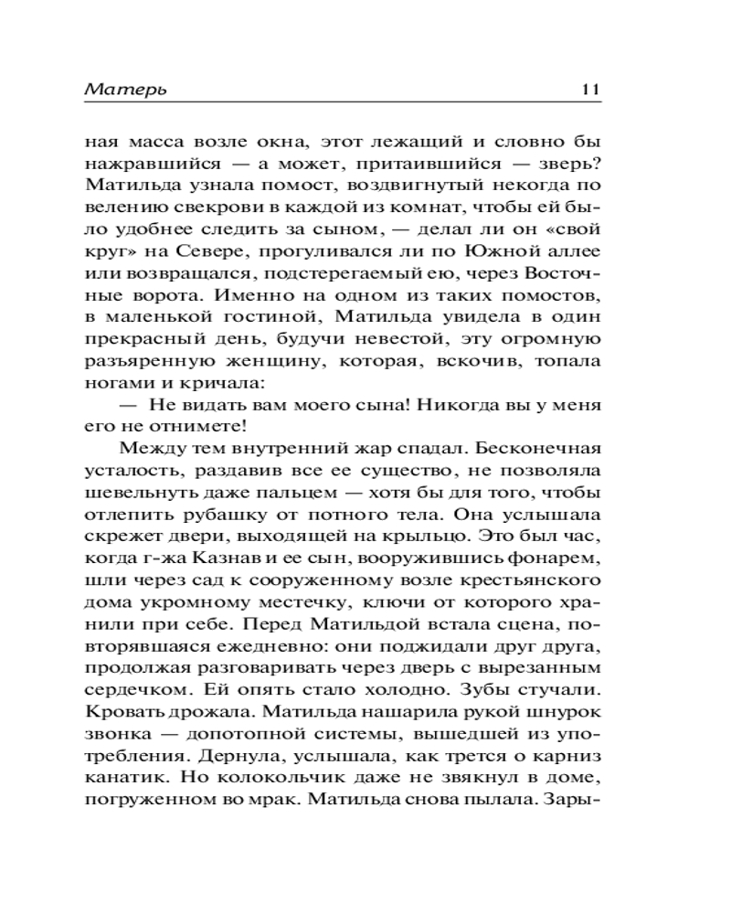Серия: Библиотека классики Нет ничего сильнее материнской любви, но иногда она имеет разрушительную силу, потому что, как и любое лекарство, в слишком больших дозах она становится ядом. Фелисите Казнав – воплощение чрезмерной заботы, она относится к своему пятидесятилетнему сыну как к слабому и глупому ребенку. Однако вопреки воле матери он женится на молодой соседке Матильде. Фелисите сгорает от ревности и клянется никогда не отпускать сына, поэтому начинает настоящую войну со своим истинным врагом – расчетливой невесткой. |