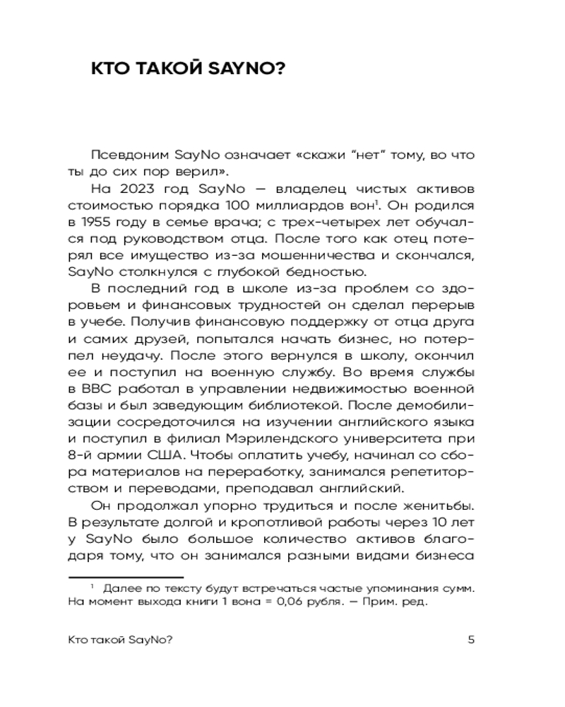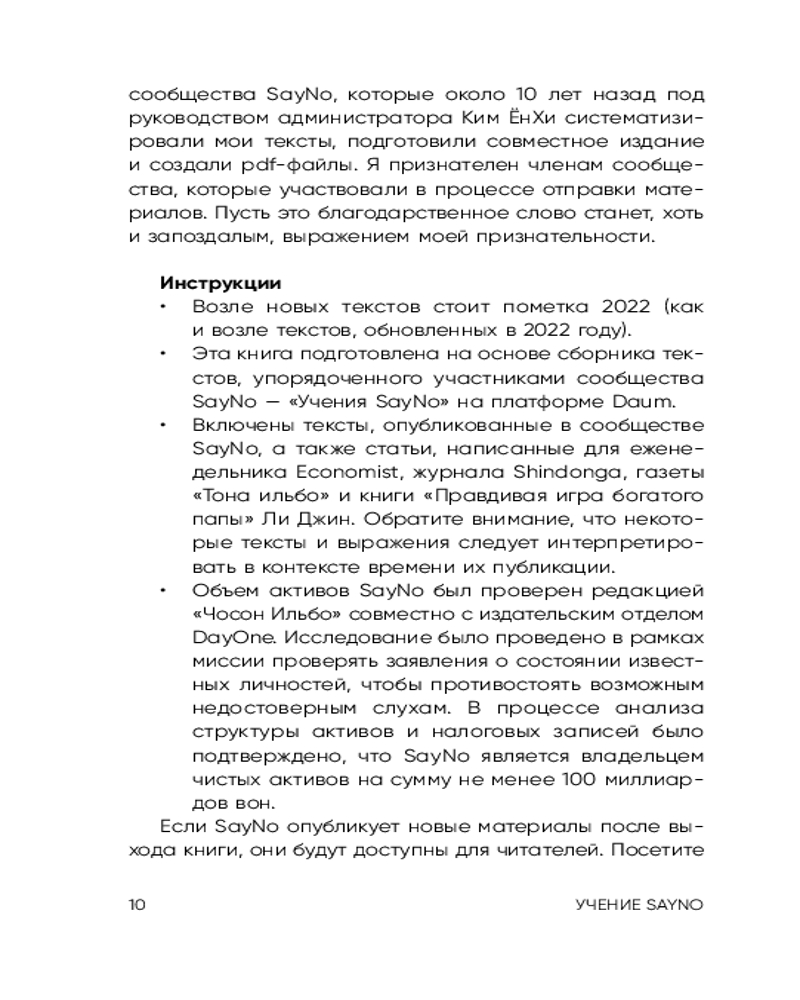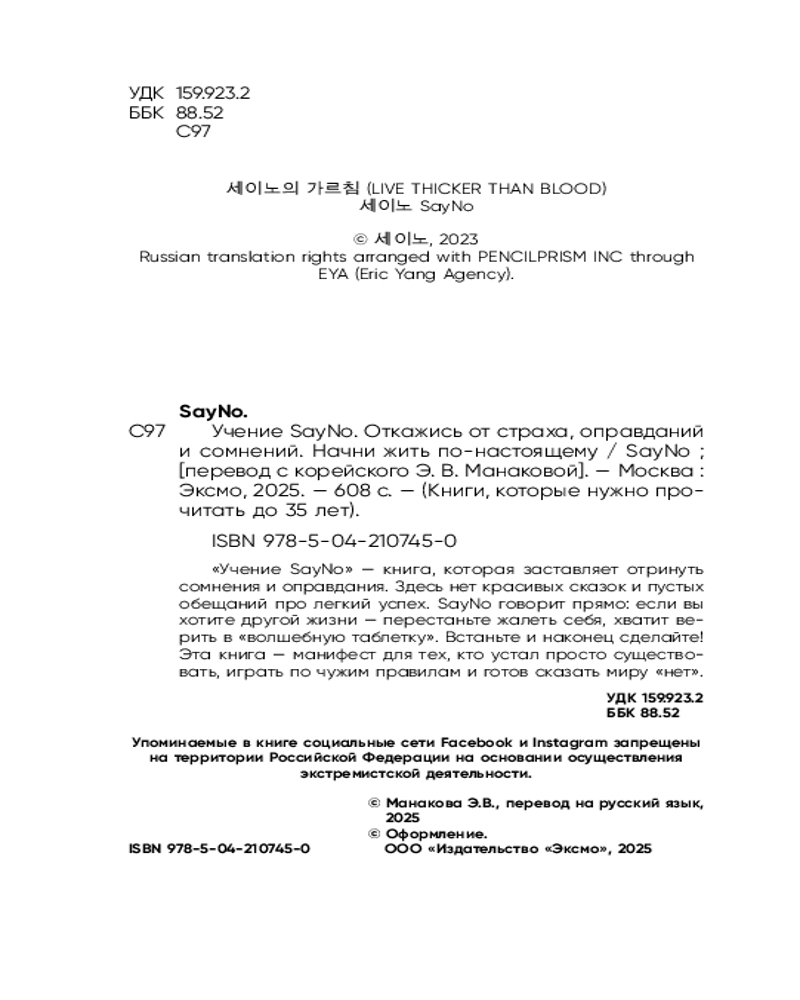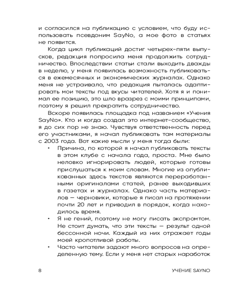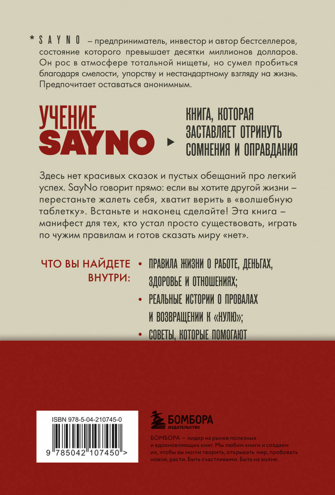 Серия: Книги, которые нужно прочитать до 35 лет SayNo — предприниматель, инвестор и автор бестселлеров, состояние которого превышает десятки миллионов долларов. Он рос в атмосфере тотальной нищеты, но сумел пробиться благодаря смелости, упорству и нестандартному взгляду на жизнь. Предпочитает оставаться анонимным. «Учение SayNo» — книга, которая заставляет отринуть сомнения и оправдания. |