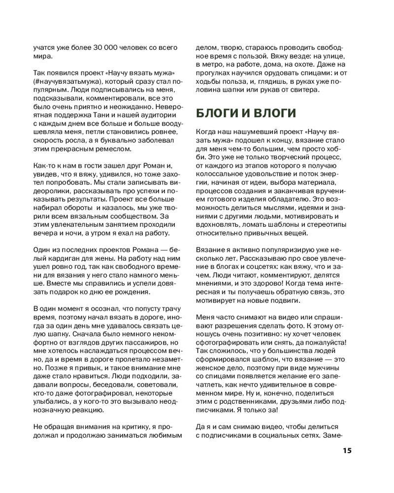 Серия: Звезды рукоделия. Таня и Андрей Курочкины Книга №1 для тех, кто хочет вязать стильно, просто и с удовольствием! Автор — Андрей Курочкин, блогер-миллионник и популяризатор современного вязания. Более 3 000 000 подписчиков в соцсетях. Его ролики набирают более 100 000 000 просмотров. По его описаниям связаны тысячи изделий по всему миру. Автор 3-х книг по современному вязанию на спицах. |