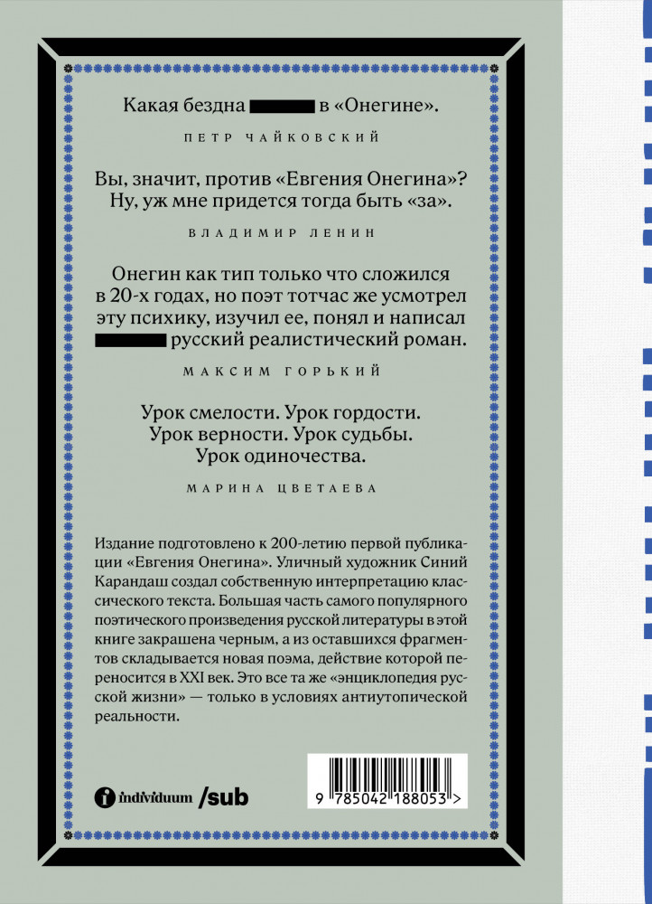 Серия: Individuum Издание подготовлено к 200-летию первой публикации «Евгения Онегина». Уличный художник Синий Карандаш создал собственную интерпретацию классического текста. Большая часть самого популярного поэтического произведения русской литературы в этой книге закрашена черным, а из оставшихся фрагментов складывается новая поэма, действие которой переносится в XXI век. Это всё та же «энциклопедия русской жизни» — только в условиях антиутопической реальности. |