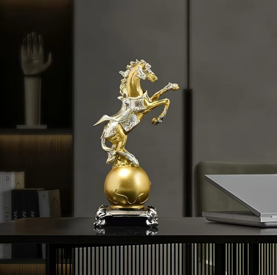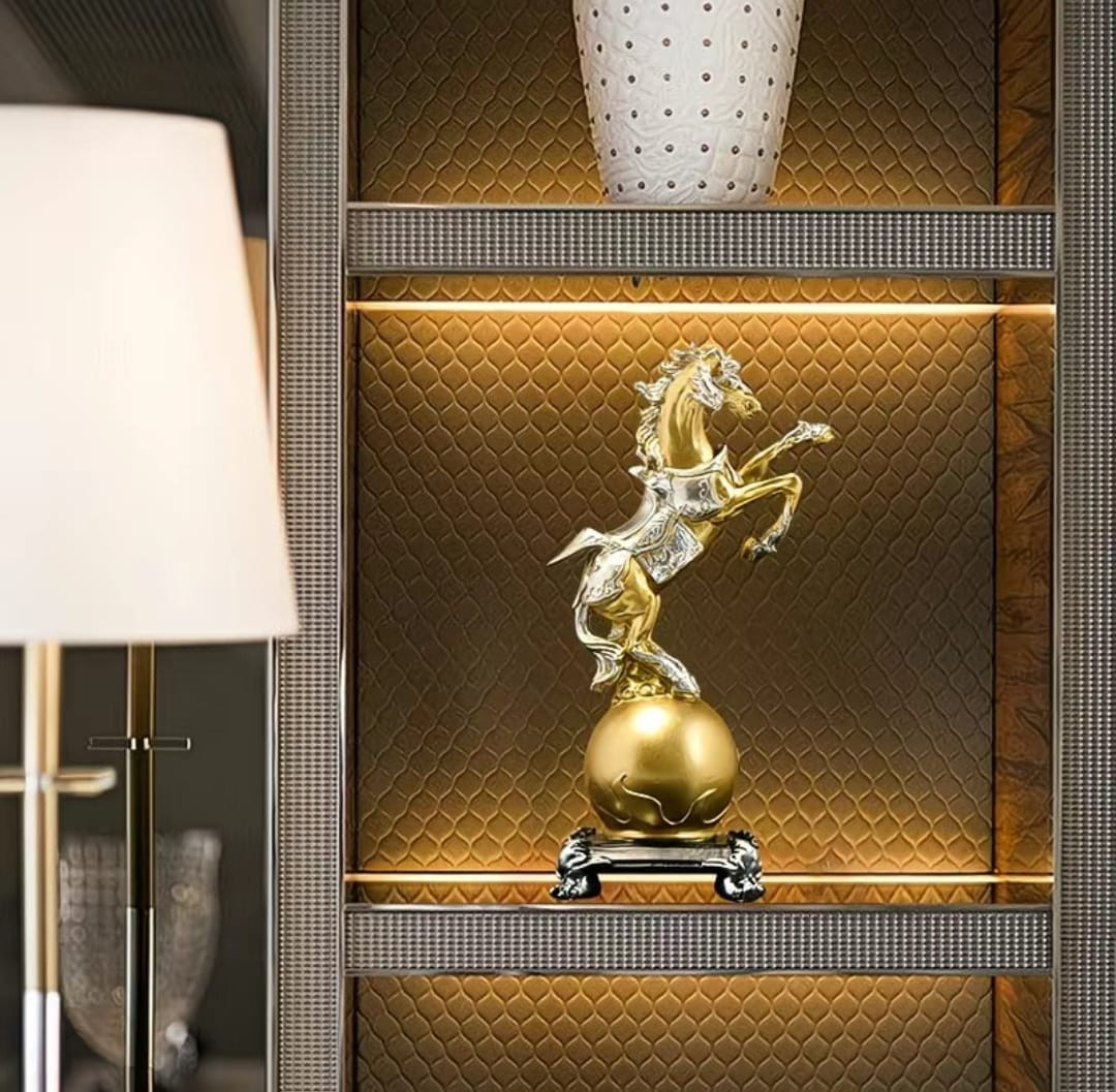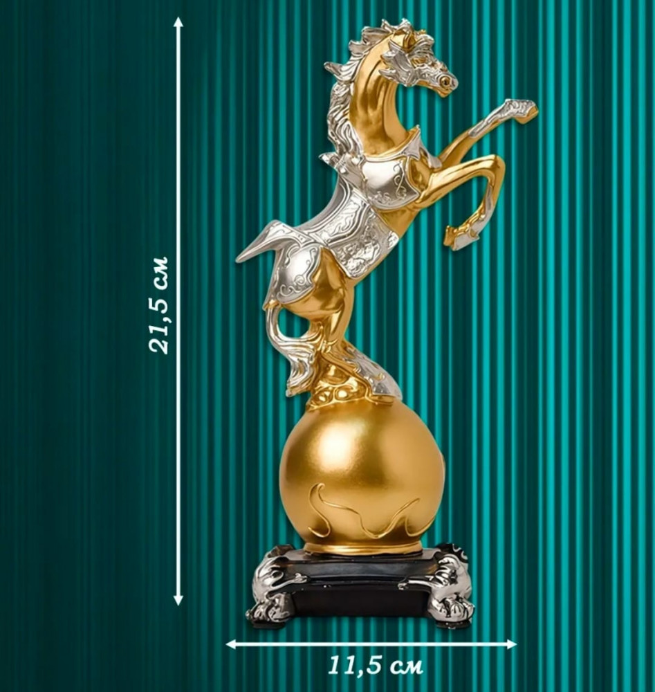 Элегантная декоративная статуэтка в виде коня станет ярким акцентом в интерьере и принесёт в дом энергию успеха, уверенности и движения вперёд. Изысканное сочетание золота и серебра придаёт изделию роскошный и благородный вид.