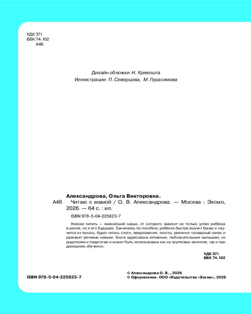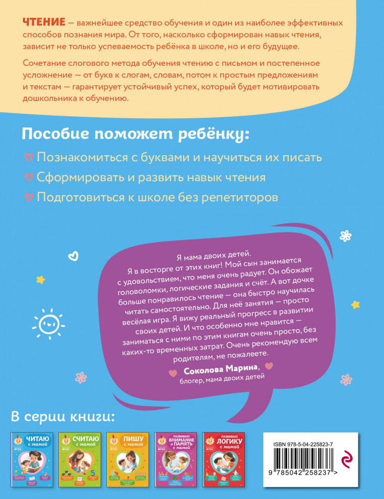 Серия: Учимся с мамой Чтение — основной навык, от которого зависит не только успех ребенка в школе, но и его будущее. Наиболее эффективный метод обучения чтению — слоговой. Сочетание этого метода с письмом и постепенным усложнением — от букв к слогам, словам, потом к простым предложениям и текстам — гарантирует устойчивый успех и прогресс, который будет заметен ребенку и станет мотивировать его к обучению. Развивающее пособие поможет ребенку легко и с удовольствием освоить базовые навыки: быстро запомнить буквы и их написание; научиться читать слоги, слова, предложения и тексты, увеличить словарный запас, развить речевые навыки. Вместе с этим пособием чтение превратится в интересное приключение, и ребенок не заметит, как пролетит время.   |