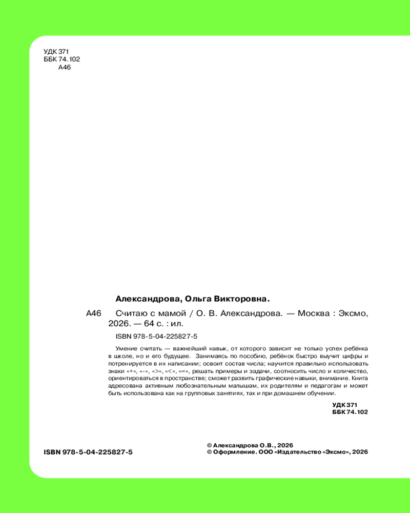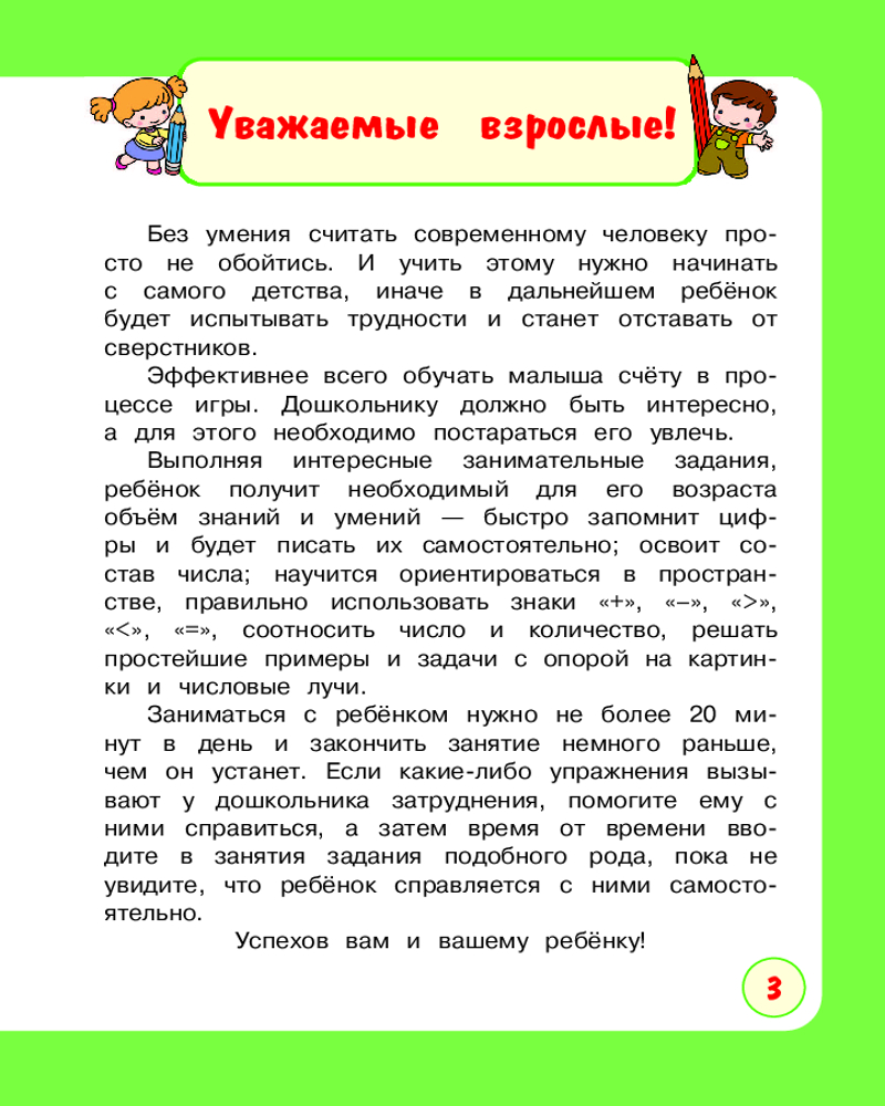 Серия: Учимся с мамой Это развивающее пособие поможет мальчикам и девочкам легко освоить базовые математические навыки: быстро запомнить цифры и научиться писать их самостоятельно; освоить состав числа и навыки ориентации в пространстве, правильно использовать знаки «+„, “-„, “>», «<», «=», соотносить число и количество, решать простейшие примеры и задачи; а также развить мелкую моторику, логику, внимание. Вместе с этим пособием каждое задание превратит счет в интересное приключение, и ребенок не заметит, как пролетит время. Книга-развивашка, предназначенная для совместных занятий мамы и ребенка, станет надежным помощником в процессе подготовки к школе. Простые задания легко выполнять дома, на прогулке или в дороге. Обучение, проходящее в виде веселой увлекательной игры, поможет ребенку не только развить ключевые навыки, но и почувствовать уверенность в своих силах. |