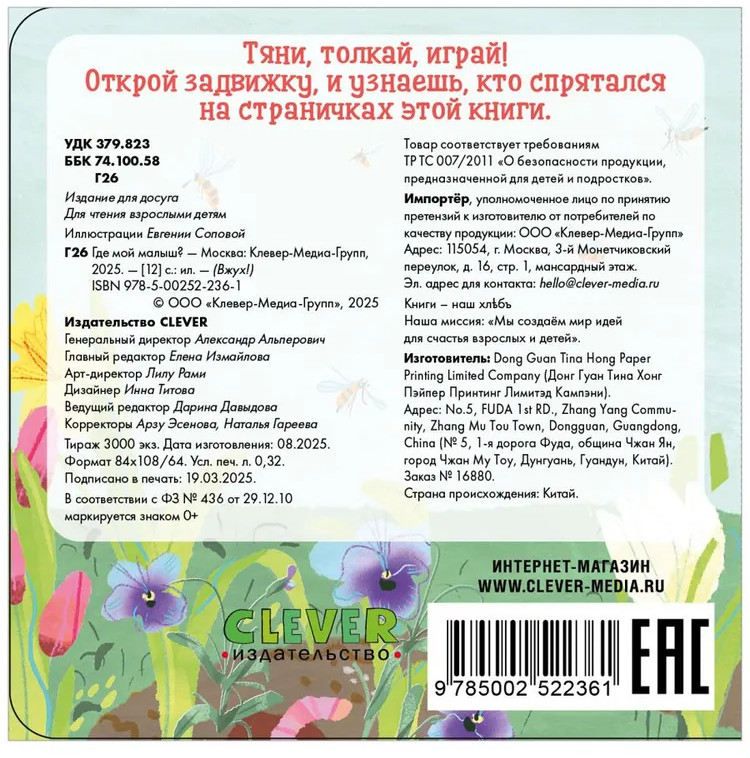 Серия: Вжух! «Где мой малыш?» — это интерактивная книжка для малышей, которые любят играть с родителями в «ку-ку». С помощью этой clever книги ребенок выучит первые слова и потренирует мелкую моторику. |