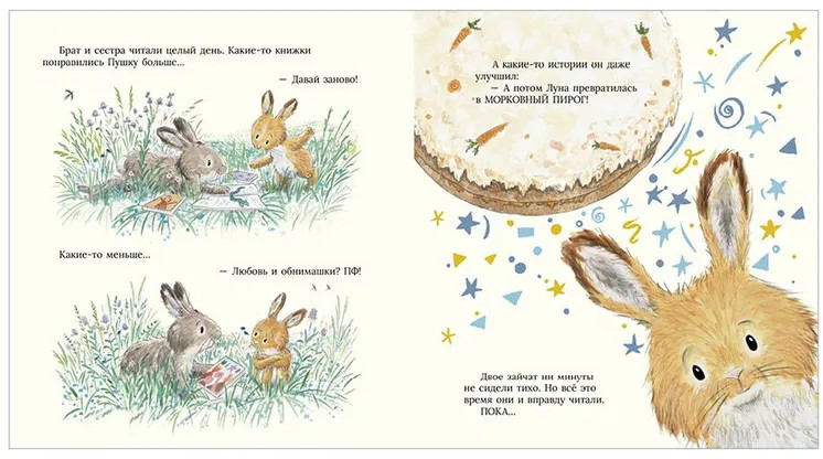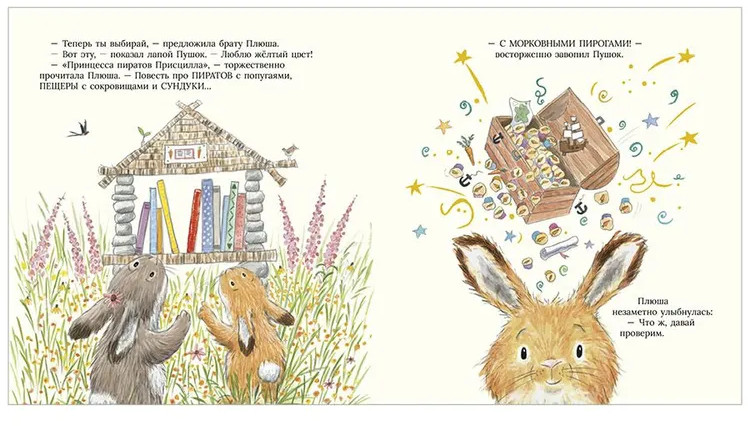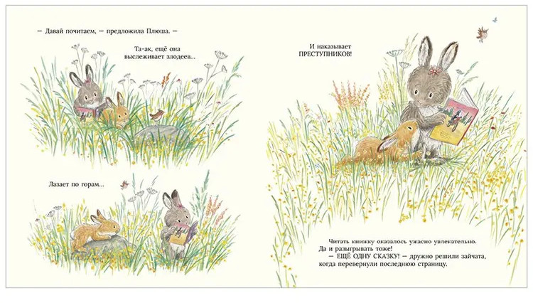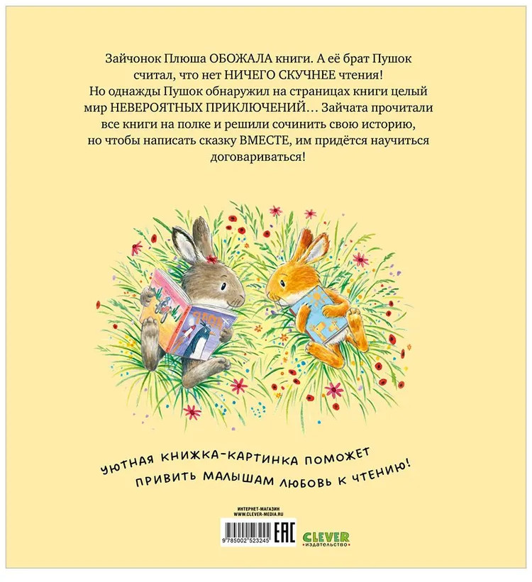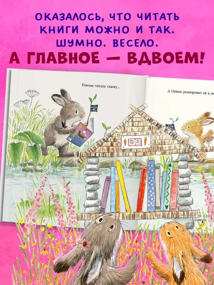 Увлекательная история книги для малышей понравится мальчикам и девочкам. Зайчонок Плюша обожала детские книжки. А ее брат Пушок считал, что нет ничего скучнее чтения! Но однажды Пушок обнаружил на страницах книги для детей целый мир невероятных приключений... Зайчата прочитали все детские книги на полке и решили сочинить свою историю, но, чтобы написать сказку вместе, им придется научиться договариваться!