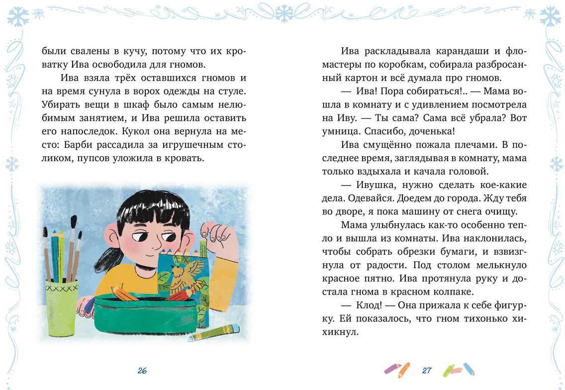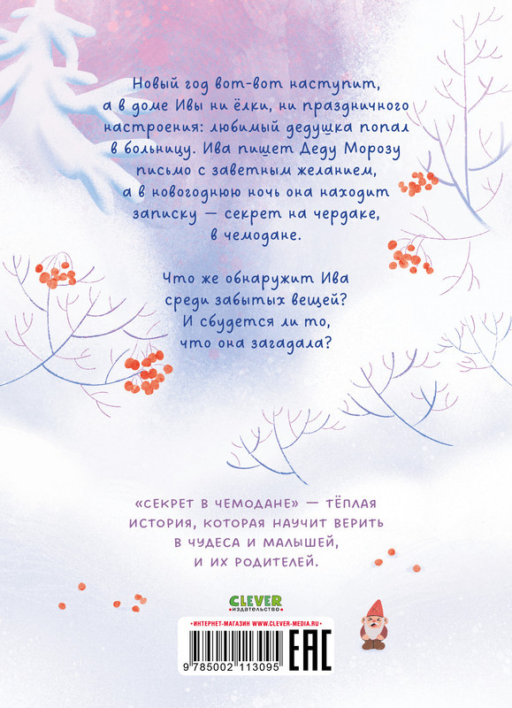 Серия: Clever-чтение Это теплая история, которая научит верить в чудеса малышей и их родителей. Новый год вот-вот наступит, а в доме Ивы ни eлки, ни праздничного настроения: любимый дедушка попал в больницу. Ива пишет Деду Морозу письмо с заветным желанием, а в новогоднюю ночь она находит записку — секрет на чердаке, в чемодане. Что же обнаружит Ива среди забытых вещей? И сбудется ли то, что она загадала? |