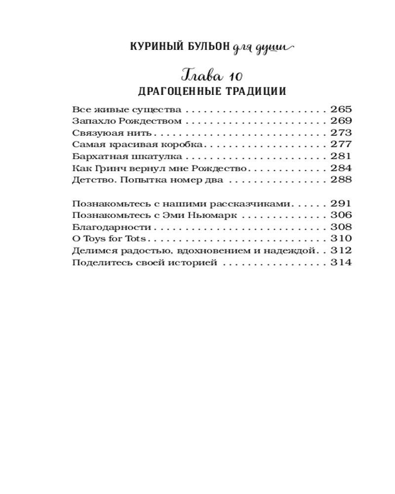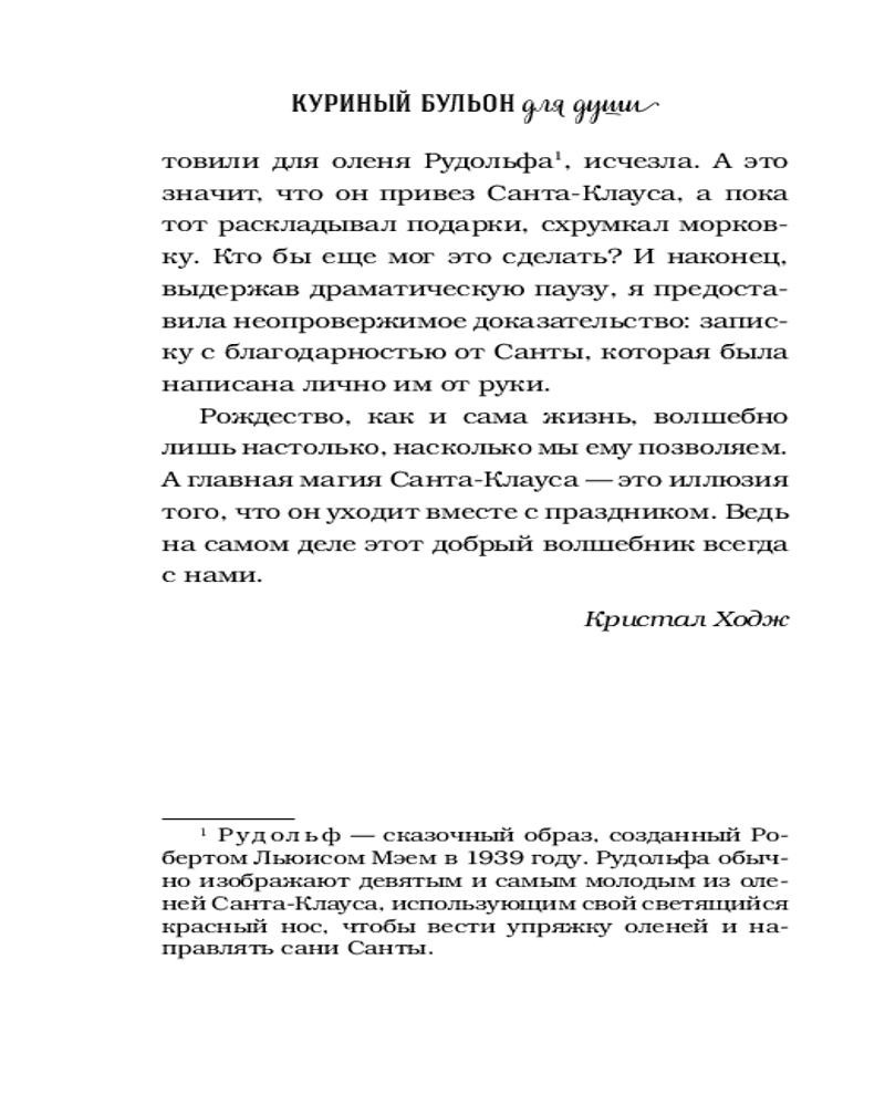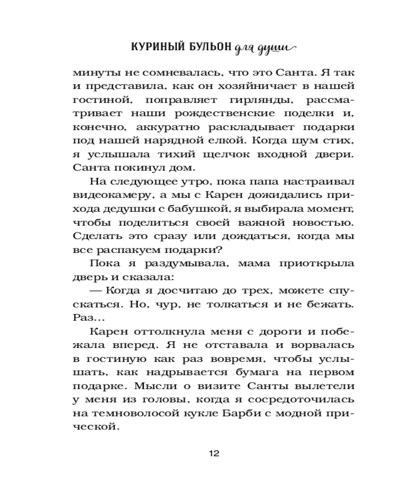 В данный момент этот товар отсутствует в продаже. Возможно, у нас найдется аналогичный или похожий товар  здесь. Серия: Куриный бульон для души (твердый переплет) Когда за окном кружит вьюга, а в доме пахнет хвоей и мандаринами, нет ничего приятнее, чем устроиться уютно в кресле со сборником маленьких добрых историй. Они поддержат вас, когда внутренние ресурсы окажутся на исходе, исцелят душевные раны, будут подогревать ваше желание перемен, подарят праздничное настроение и напомнят, что для счастья иногда нужно совсем немного.