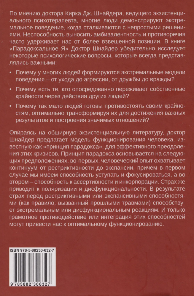 💳 Оплатить за товар можно при получении 🇰🇿 Есть бесплатная доставка по Казахстану 🎁 Копите бонусы с каждой покупки Успешно применяя свою модель к различным дисфункциональным синдромам, доктор Шнайдер переходит к описанию ее значимости для психологического здоровья. На примере многочисленных свидетельств испытуемых он показывает применимость данной модели в области творчества, физического здоровья, для религиозных и социальных организаций, в сфере воспитания детей и психотерапии. |