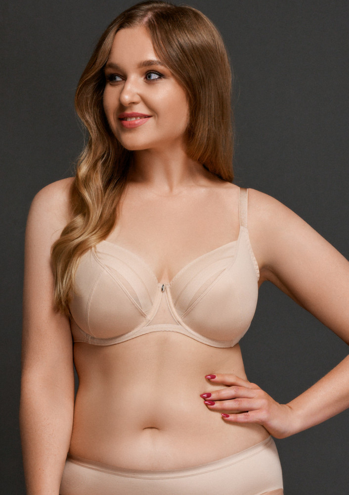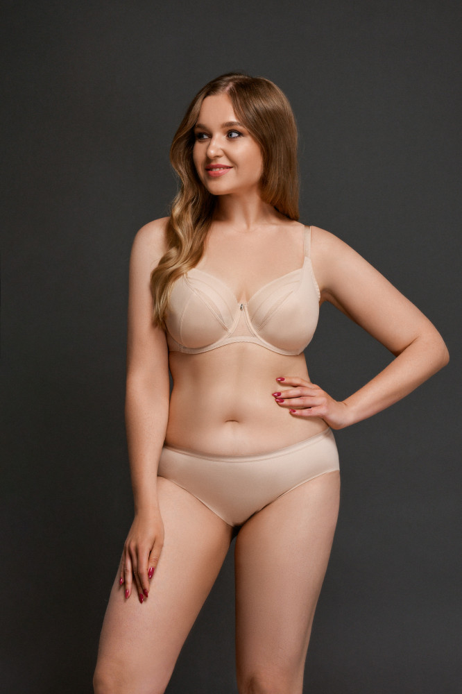 Мягкая чашка с тройным диагональным членением. Нижние детали чашки ламинированы хлопковым полотном. Вехние детали чашки декорированы геометричным кружевом в полоску на эластичной сетчатой фнукциональной подкладке. Ластовица прозрачная выполнена из неэластичного сетчатого полотна. Модель декорирована лаконичным металлическим украшением. Боковые детали стана выполнены из эластичного трикотажного полотна. Стан маечного типа.