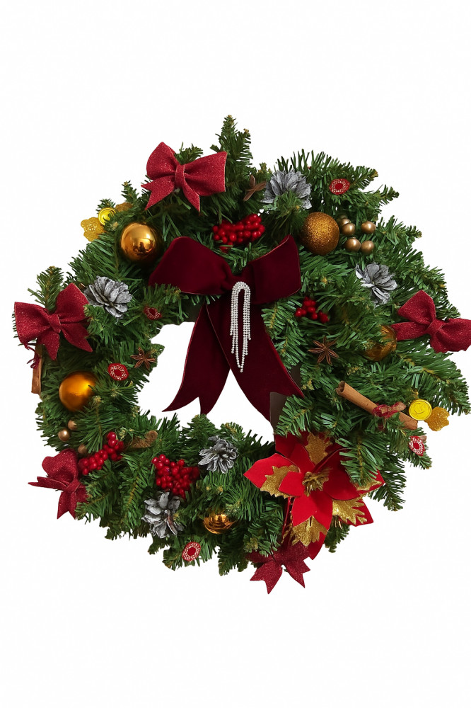 Данный рождественский венок сделан вручную с особой любовью и вниманием к деталям. Его особенностью является присутствие натуральных материалов — шишек, подияна, корицы и ванильных палочек, благодаря которым создается неповторимый аромат и атмосфера настоящего Нового года и Рождества. Тонкий пряный запах венка напоминает уютный аромат глинтвейна, дарит ощущение тепла, домашнего уюта и зимней сказки. Яркие акценты в виде декоративных ягод, бантиков и елочной хвои делают венок идеальным украшением для двери, камина или праздничного стола. Такой венок станет не просто элементом декора, а душевным символом праздника, который подарит настроение волшебства и ожидания чуда каждому дому.