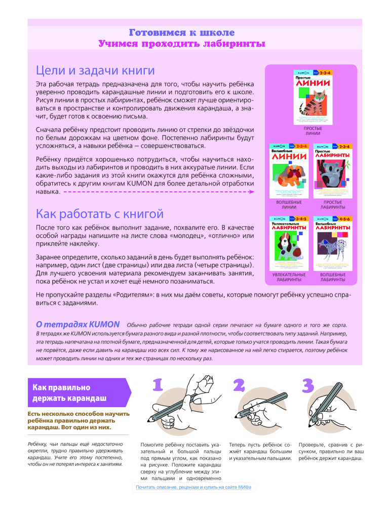 Готовимся к школе. Учимся проходить лабиринтыВ данный момент этот товар отсутствует в продаже. Возможно, у нас найдется аналогичный или похожий товар здесь. Серия: Рабочая тетрадь KUMON Эта рабочая тетрадь предназначена для того, чтобы научить ребёнка уверенно проводить линии карандашом и подготовить его к школе. Рисуя линии в простых лабиринтах, ребёнок сможет лучше ориентироваться в пространстве и контролировать движения карандаша, а значит, будет готов к освоению письма. |