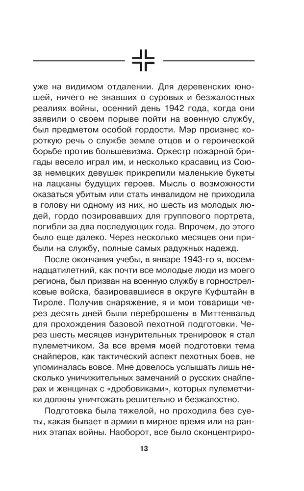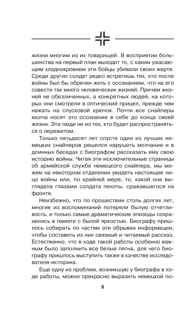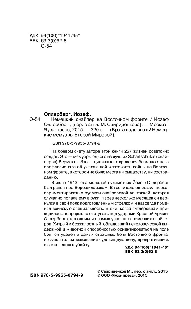 Немецкий снайпер на Восточном фронтеВ данный момент этот товар отсутствует в продаже. Возможно, у нас найдется аналогичный или похожий товар здесь. Серия: Врага надо знать! Немецкие мемуары Второй Мировой На боевом счету автора этой книги 257 жизней советских солдат. Это — мемуары одного из лучших Scharfschutze (снайперов) Вермахта. Это — циничные откровения безжалостного профессионала об ужасающей жестокости войны на Восточном фронте, в которой не было места ни рыцарству, ни состраданию. |