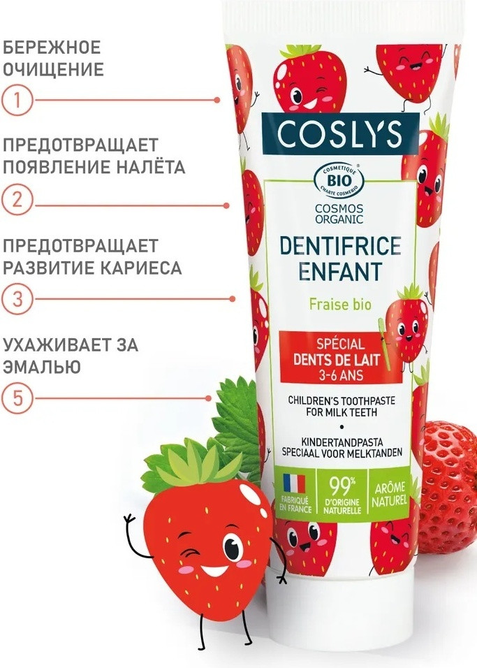 Натуральная детская зубная паста Coslys разработана с учётом потребностей молочных зубов. Бережно очищает зубы, не повреждая эмаль, предотвращает появление налета и развитие кариеса. Подходит для детей 3+. С экстрактами зеленого чая и ромашки. Подходит для ежедневного использования.
