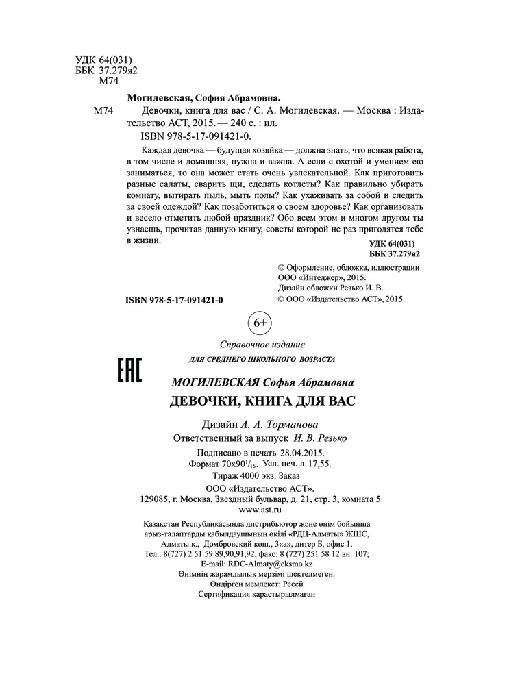 Я покупала ее в подарок дочке. Дочке понравилась книга, надеюсь, в дальнейшем эта книга пригодится ей. Книга предназначена для девочек от 8-9 лет. Качество книги хорошее, листы плотные. Содержание книги состоит из пяти частей, начиная со стряпни, как делать уборку, как ухаживать за собой, личная гигиена и ЗОЖ, и заканчивая веселым праздником. Спасибо большое за доставку, flip.kz!