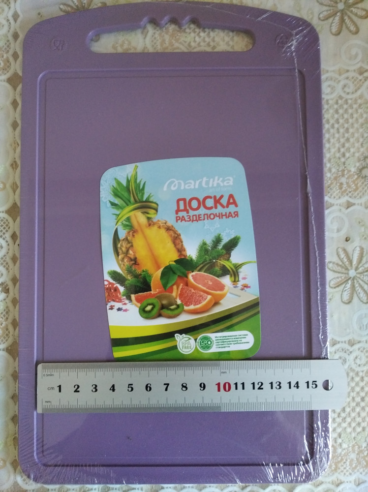 Разделочная доска понравилась. Удобный размер, яркая, достаточно плотный пластик, хорошо моется. Рекомендую к покупке.
