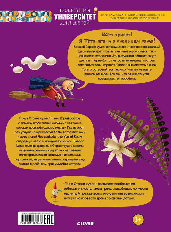 Виммельбух «Год в Стране чудес» познакомит ребенка с временами года и поможет выучить все меcяцы по порядку. Разглядывайте фантастические иллюстрации, знакомьтесь с милыми персонажами и играйте в любимую игру «найди и покажи»! Каждый разворот посвящен своему месяцу. Обсудите с малышом, чем один месяц отличается от другого, как живут и чем занимаются жители Страны чудес в течение года. Поинтересуйтесь, какие месяцы ваш ребенок любит больше всего. В конце книги маленького читателя ждет сюрприз — увлекательный лабиринт. Детальные иллюстрации, большой формат, милые герои — ваш малыш будет в восторге! |