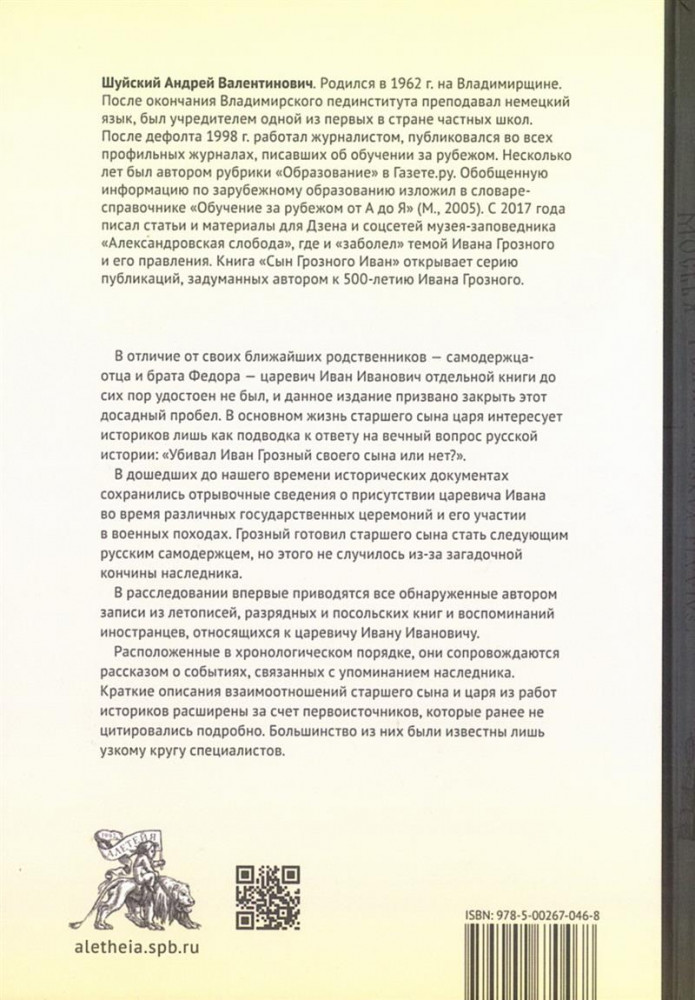 В данный момент этот товар отсутствует в продаже. Возможно, у нас найдется аналогичный или похожий товар здесь. В отличие от своих ближайших родственников — самодержца-отца и брата Федора — царевич Иван Иванович отдельной книги до сих пор удостоен не был, и данное издание призвано закрыть этот досадный пробел. В основном жизнь старшего сына царя интересует историков лишь как подводка к ответу на вечный вопрос русской истории: «Убивал Иван Грозный своего сына или нет?» В дошедших до нашего времени исторических документах сохранились отрывочные сведения о присутствии царевича Ивана во время различных государственных церемоний и его участии в военных походах. Грозный готовил старшего сына стать следующим русским самодержцем, но этого не случилось из-за загадочной кончины наследника.
