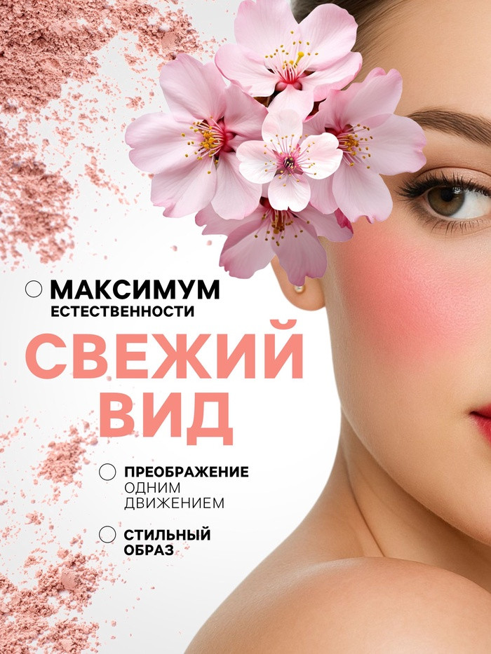 Мелкодисперсная текстура румян ложится ровно, легко растушёвывается и наслаивается без пятен. Формула комфортна для кожи — не сушит и не подчеркивает поры, а компактный формат идеально подходит для косметички.