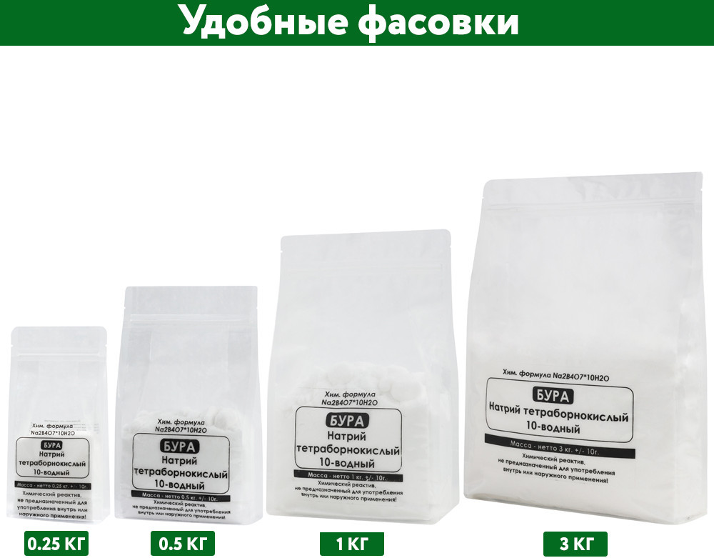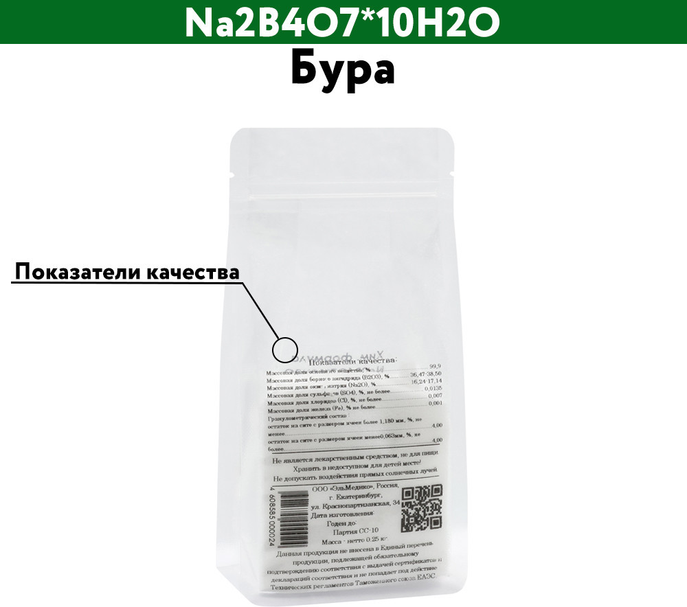 Натрий тетраборнокислый 10-водный (также известный как тетраборат натрия или бура 10-водная, формула Na₂B₄O₇·10H₂O) — это кристаллическое вещество белого цвета. Представляет собой бесцветный прозрачный порошок или мелкие кристаллы, обладающие слабощёлочными свойствами и хорошо растворяющиеся в воде. Качественная химия в удобной упаковке с многоразовым замком.