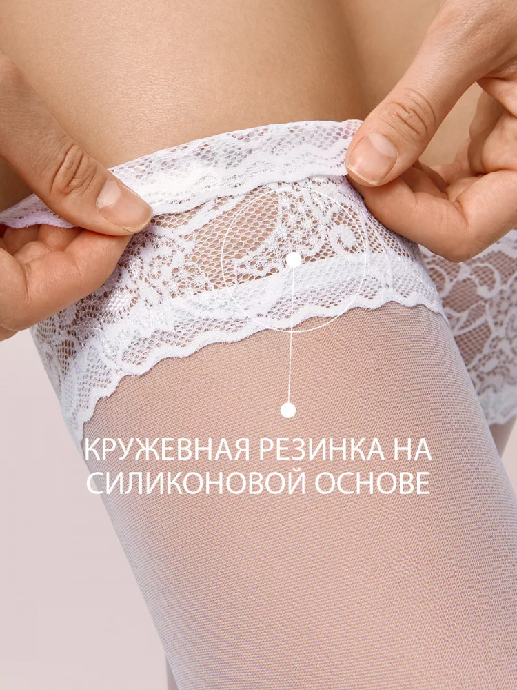 • стильная кайма шириной 8 см с силиконовой лентой, декорированная ажурным кружевом, комфортно фиксирует чулки на ноге в течение всего дня;