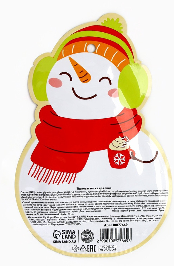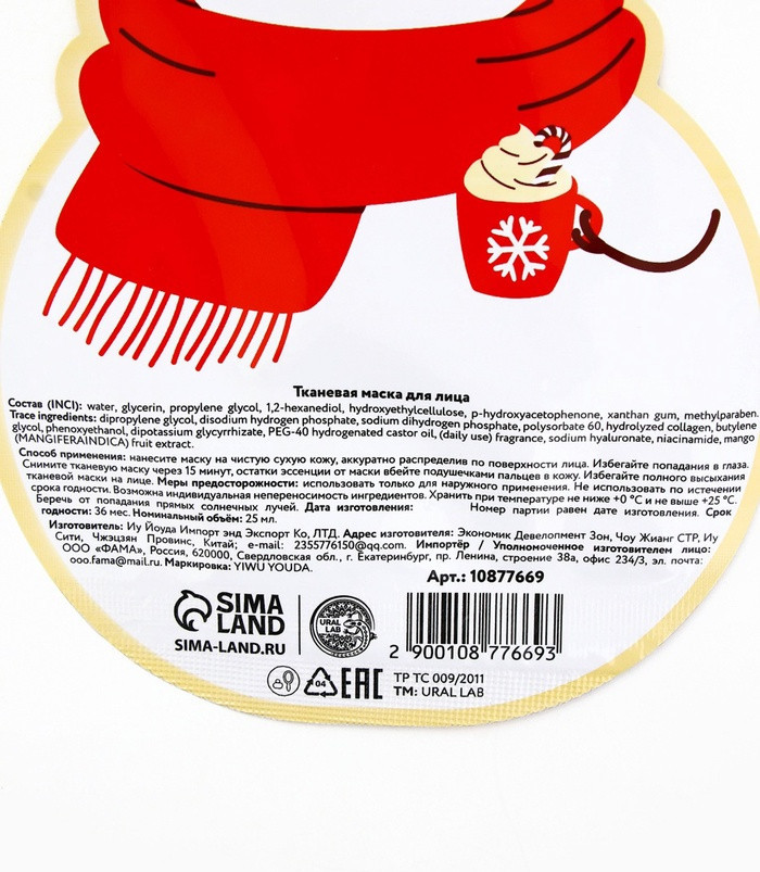 Ural lab Тканевая маска для лица питательная с экстрактом манго и гиалуроновой кислотой