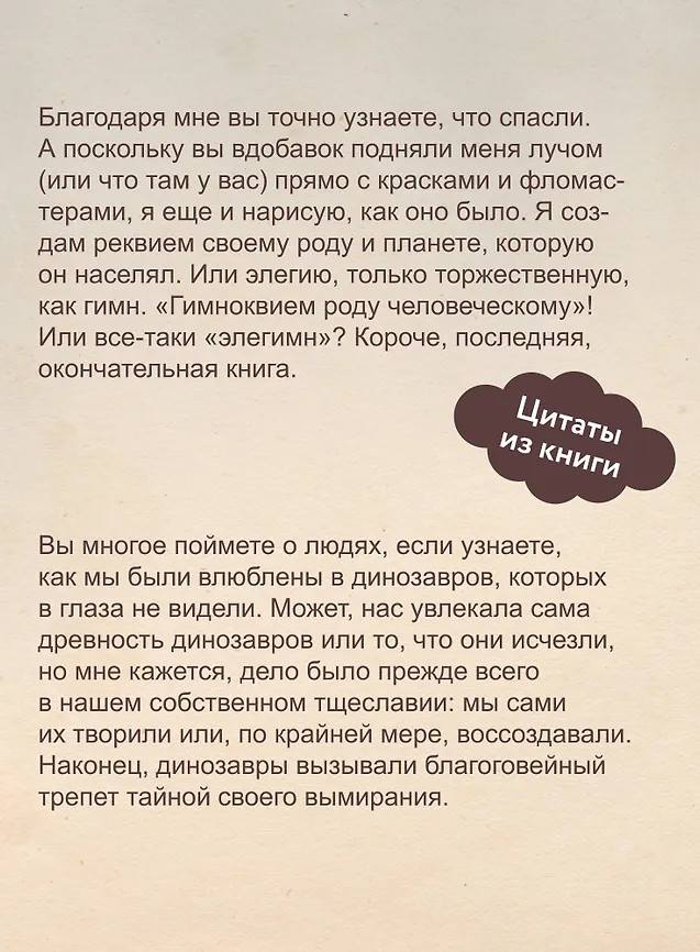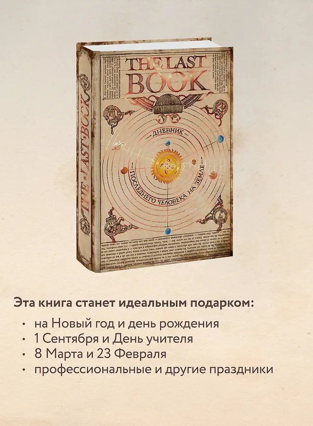 The Last Book. Дневник последнего человека на Землескоро В данный момент этот товар отсутствует в продаже. Возможно, у нас найдется аналогичный или похожий товар здесь. Роскошное подарочное издание, книга-артефакт от создателей бестселлера The Book. Это история Ноя, последнего землянина, который превратил свой дневник в гимн погибшему человечеству — собрал все самое выдающееся, прекрасное и странное, что было создано человеком. Горячая рекомендация редакции МИФа. После мировой катастрофы Ной очнулся на космическом корабле, уносящем его в неизвестность. Чтобы сохранить рассудок и справиться с одиночеством и печалью, Ной создал самую последнюю, окончательную книгу — и она перед вами. |