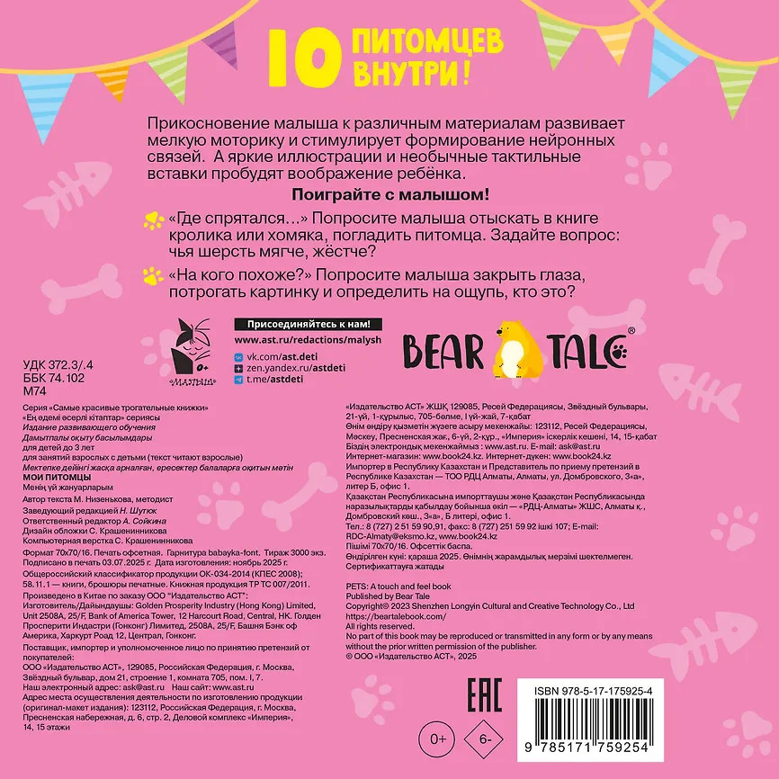 Серия: Самые красивые трогательные книжки Серия инновационных тактильных книг для самых маленьких! Какова на ощупь шерсть кролика или чешуя золотой рыбки? Кожа ящерицы или хамелеона? А как интересно потрогать панцирь краба или перышки попугая! Эти книги подарят малышу первое знакомство с самыми разными животными, а необычные тактильные ощущения способствуют формированию нейронных связей. Текст книги подготовлен практикующим методистом и снабжен методическими рекомендациями, что позволяет в игровой форме стимулировать разностороннее развитие ребенка. Играйте, учитесь, развивайтесь! |