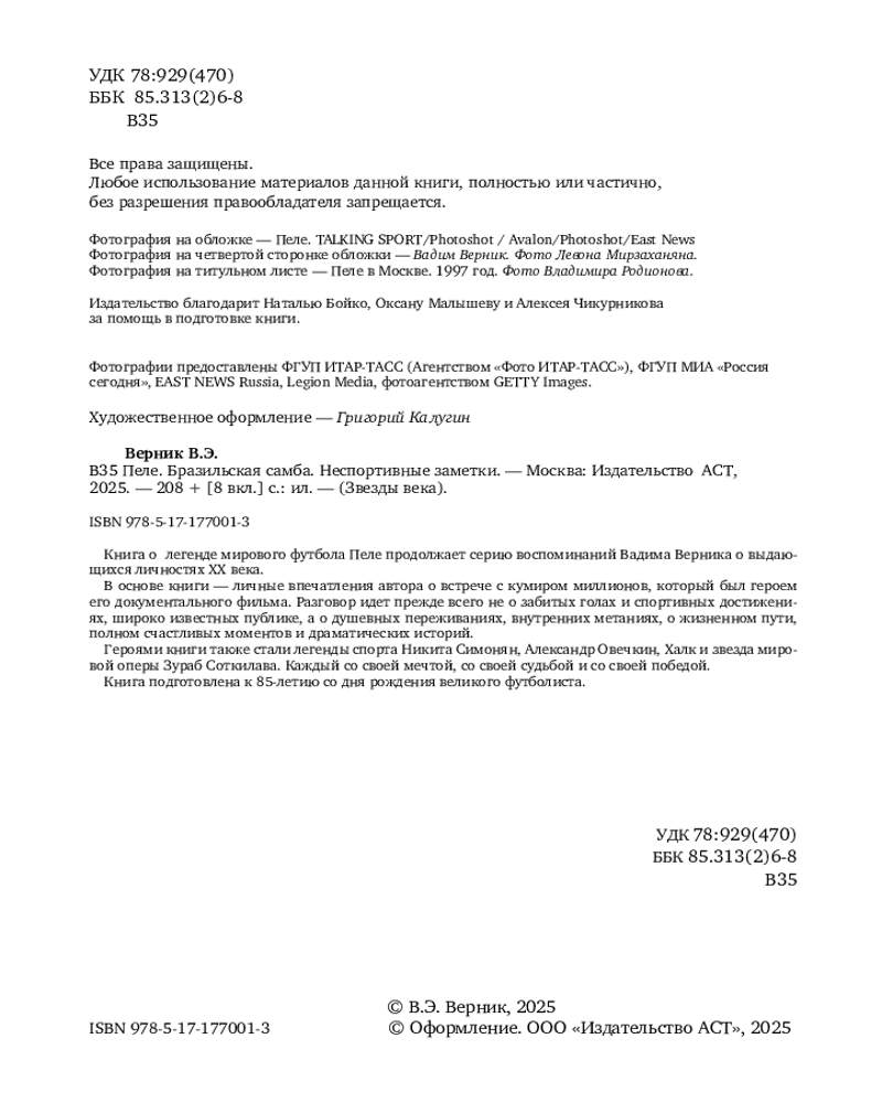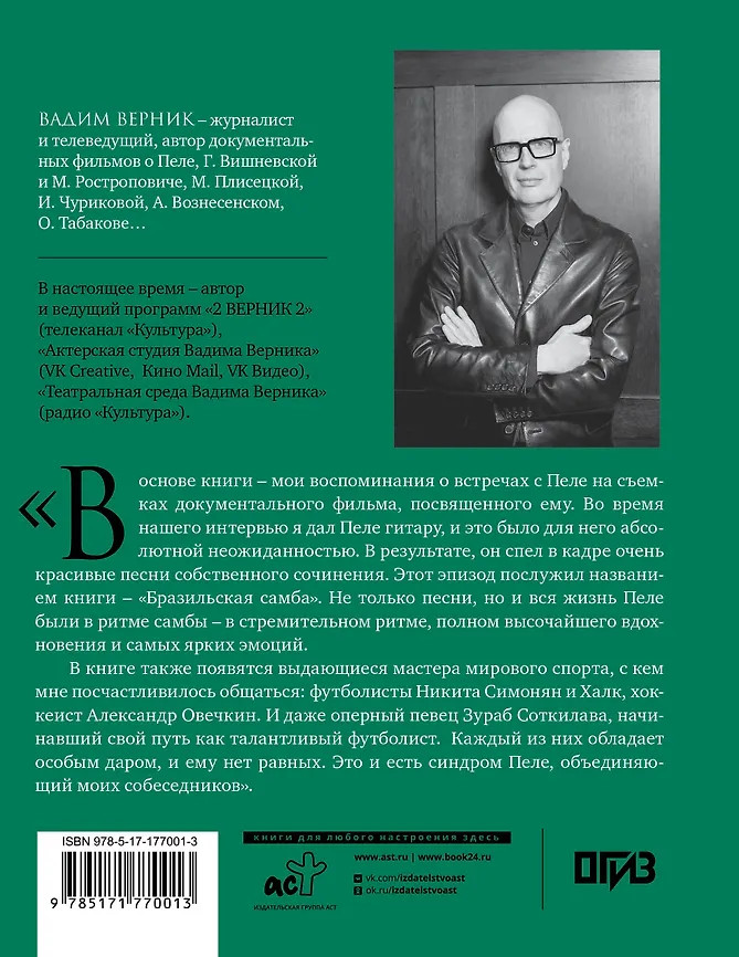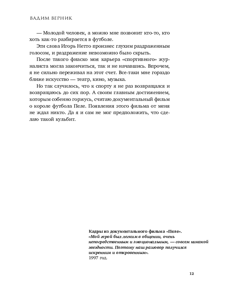 Серия: Звезды века Книга о легенде мирового футбола Пеле продолжает серию воспоминаний Вадима Верника о выдающихся личностях XX века. В основе книги — личные впечатления автора о встрече с кумиром миллионов, который был героем его документального фильма. Разговор идет прежде всего не о забитых голах и спортивных достижениях, широко известных публике, а о душевных переживаниях, внутренних метаниях, о жизненном пути, полном счастливых моментов и драматических историй. Героями книги также стали легенды спорта Никита Симонян, Александр Овечкин, Халк и звезда мировой оперы Зураб Соткилава. Каждый со своей мечтой, со своей судьбой и со своей победой. Книга подготовлена к 85-летию со дня рождения великого футболиста. |