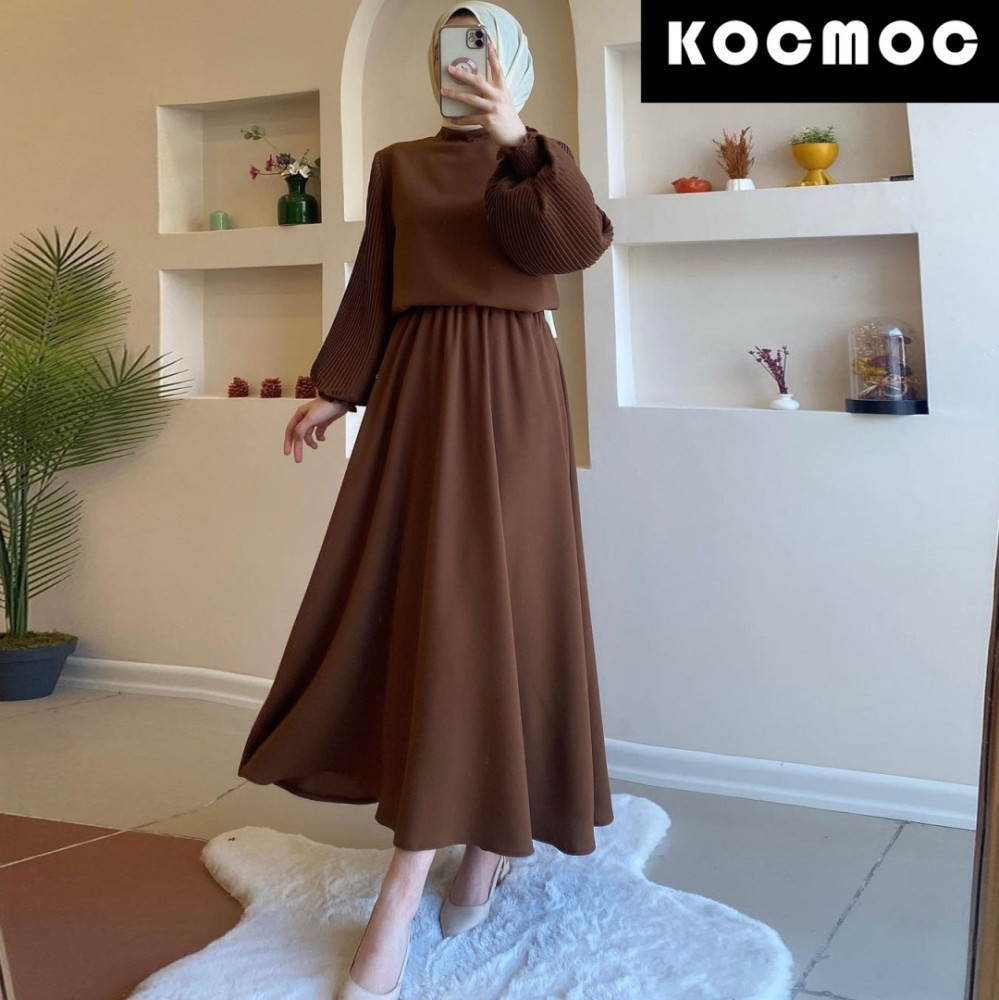 Этот стильный наряд доступен в светло-хаки и тёмно-коричневом цветах. Верхняя часть с высоким воротником и рукавами-буфами с оборками, а нижняя часть представляет собой длинную юбку, создавая элегантный и благородный образ. Платок в тон добавляет нотку простоты и изысканности, делая наряд подходящим как для повседневных, так и для официальных случаев, демонстрируя утончённый и сдержанный стиль.