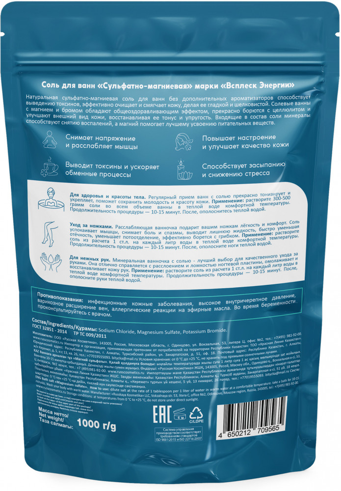Натуральная сульфатно-магниевая соль для ванн без дополнительных ароматизаторов способствует выведению токсинов, эффективно очищает и смягчает кожу, делая ее гладкой и шелковистой. Солевые ванны с магнием и бромом обладают общеоздоравливающим эффектом, прекрасно борются с целлюлитом и улучшают внешний вид кожи, восстанавливая ее тонус и упругость. Входящие в состав соли минералы способствуют снятию воспалений, а магний помогает лучшему усвоению питательных веществ.