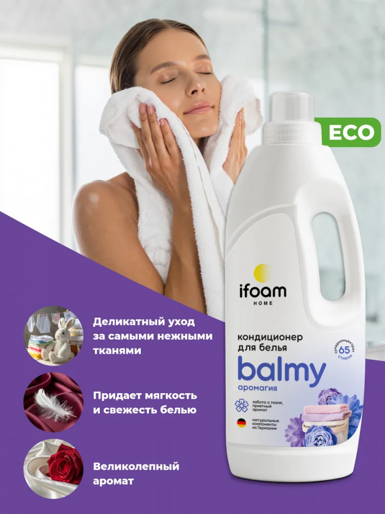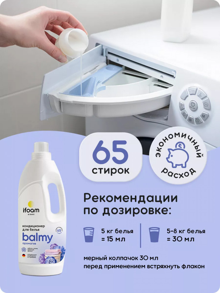 Кондиционер-ополаскиватель для белья Balmy сохранит цвет изделий, облегчит глажку, подойдет для любого вида ткани, подарит неповторимое ощущение свежести. Гипоаллергенный безопасный кондиционер полностью выполаскивается из ткани, поэтому подходит аллергикам и людям с чувствительной кожей. Концентрат от бренда ifoam подходит для вещей малыша с первых дней жизни. Наше ароматное экосредство содержит натуральные компоненты из Германии, поэтому оно не вызовет раздражений и аллергии. В составе ароматизированного средства нет вредных химических веществ. Он не содержит фосфаты и агрессивные ПАВ. Мы заботимся о вас, поэтому предлагаем экологичный кондиционер.