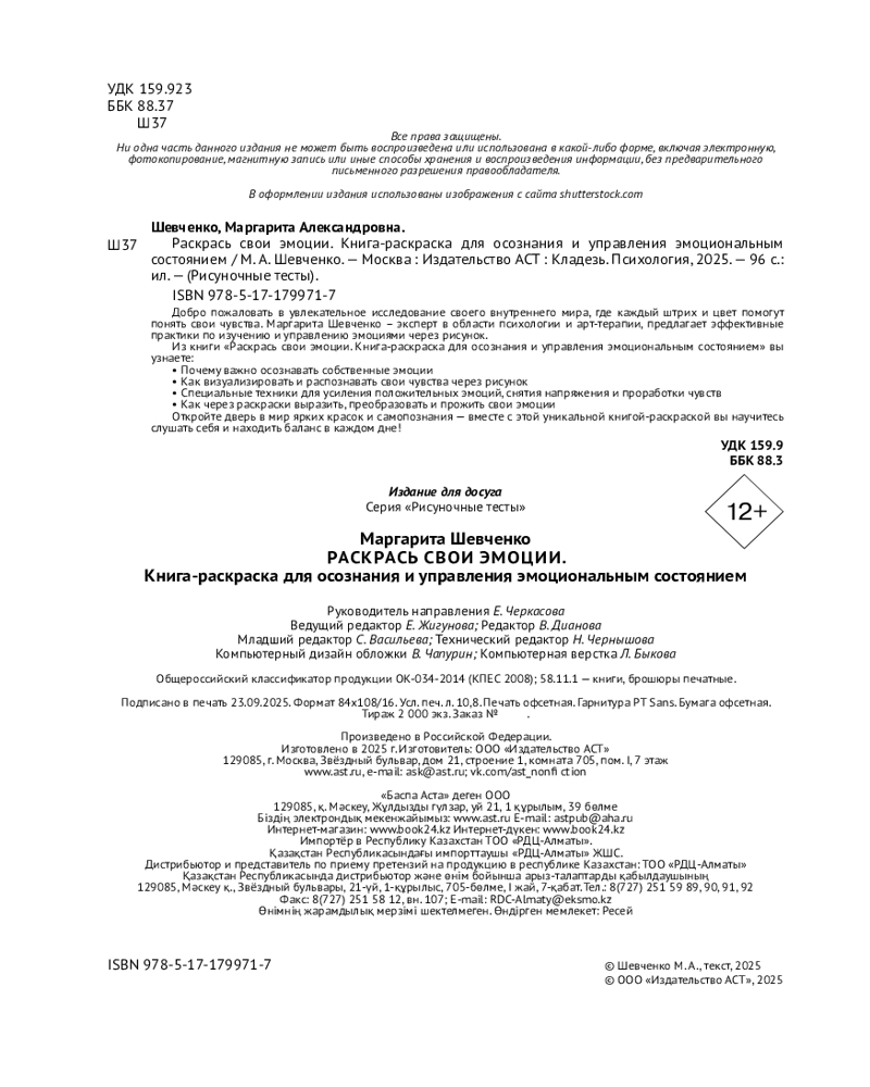 💳 Оплатить за товар можно при получении 🇰🇿 Есть бесплатная доставка по Казахстану 🎁 Копите бонусы с каждой покупки Серия: Рисуночные тесты Добро пожаловать в увлекательное исследование своего внутреннего мира, где каждый штрих и цвет помогут понять свои чувства. Маргарита Шевченко — эксперт в области психологии и арт-терапии — предлагает эффективные практики по изучению эмоций и управлению ими через рисунок. |