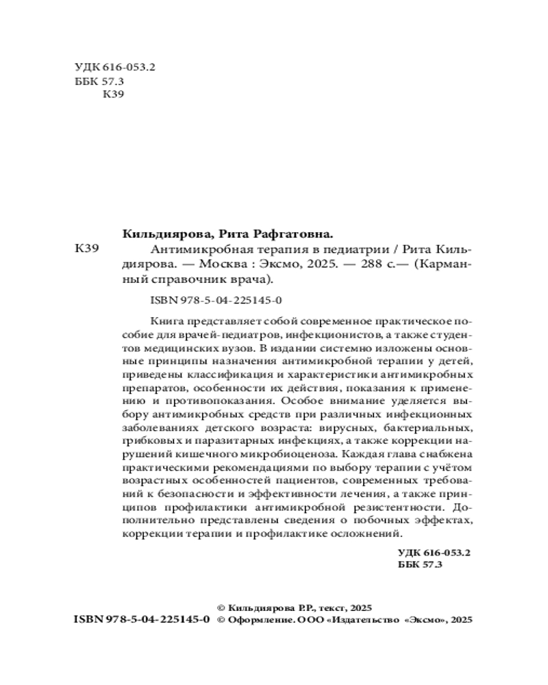 Серия: Карманный справочник врача Руководство по антимикробной терапии в педиатрии представляет собой современное практическое пособие для врачей-педиатров, инфекционистов и других специалистов, работающих с детьми. В книге подробно рассматриваются принципы рационального применения антибактериальных, противовирусных, антигрибковых и антипаразитарных препаратов с учетом особенностей детского возраста. |