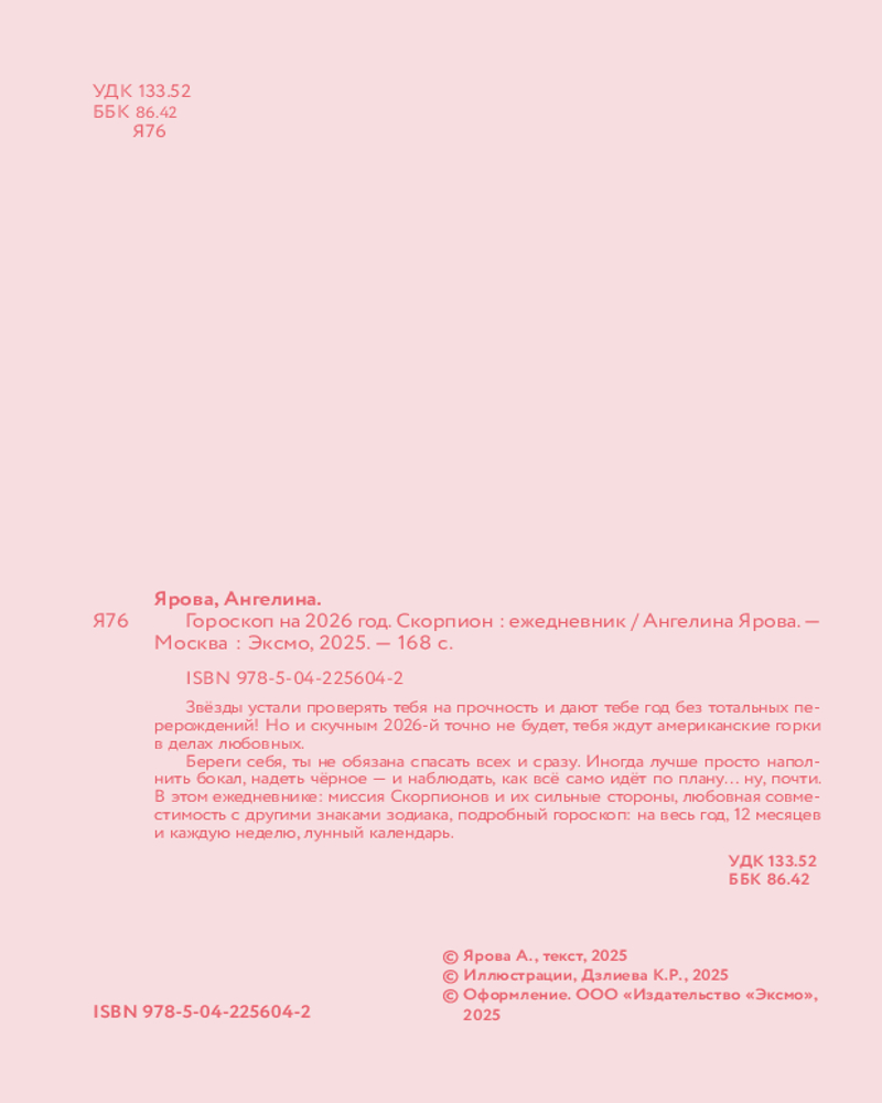 Серия: Новый Год. Подарочные ежедневники. Знаки зодиака Звёзды устали проверять тебя на «прочность» и дают тебе год без тотальных перерождений! Но и скучным 2026 точно не будет, тебя ждут американские горки в делах любовных. Береги себя, ты не обязана спасать всех и сразу. Иногда лучше просто наполнить бокал, надеть чёрное — и наблюдать, как всё само идёт по плану... Ну, почти. |