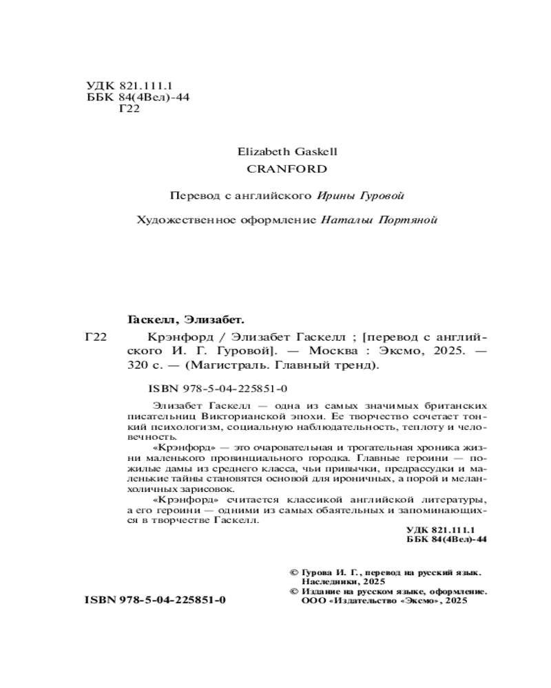 💳 Оплатить за товар можно при получении 🇰🇿 Есть бесплатная доставка по Казахстану 🎁 Копите бонусы с каждой покупки Серия: Магистраль. Главный тренд Элизабет Гаскелл — одна из самых значимых британских писательниц викторианской эпохи. Её творчество сочетает тонкий психологизм, социальную наблюдательность, теплоту и человечность. «Крэнфорд» — это очаровательная и трогательная хроника жизни маленького провинциального городка. Главные героини — пожилые дамы из среднего класса, чьи привычки, предрассудки и маленькие тайны становятся основой для ироничных, а порой и меланхоличных зарисовок. «Крэнфорд» считается классикой английской литературы, а его героини — одними из самых обаятельных и запоминающихся в творчестве Гаскелл. |