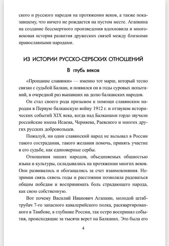 Это книга об авторе бессмертного марша «Прощание славянки» — композиторе и дирижёре Василии Ивановиче Агапкине, об истории его марша, перешагнувшего своё время и сегодня звучащего так же свежо и мощно, как и более ста лет назад, когда он был создан в 1912 году. В книге использованы редкие архивные материалы, документы, фотографии, приводятся уникальные интервью автора книги со сподвижниками Агапкина, его близкими, участниками исторического парада 7 ноября 1941 года на Красной площади. В конце книги приводятся справочные сведения о некоторых композиторах, дирижёрах и исполнителях, творчески связанных с В.И. Агапкиным в области военной музыки.