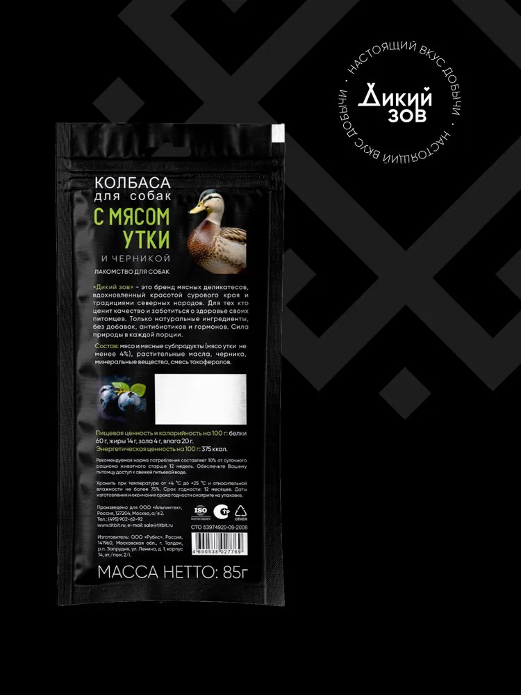 TiTBiT Колбаса для собак с мясом утки и черникой «Дикий зов»